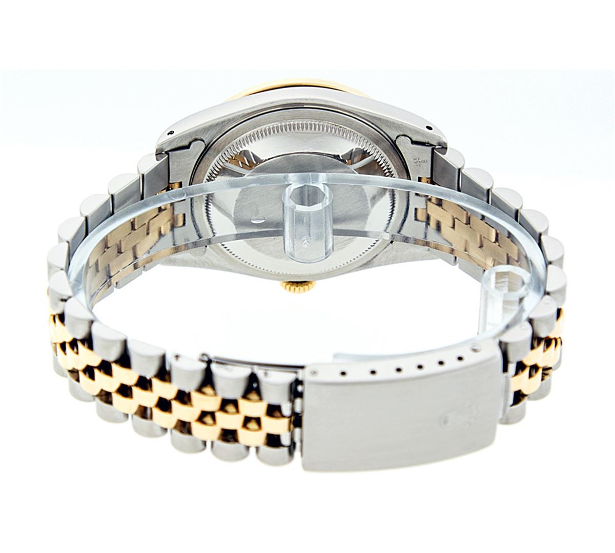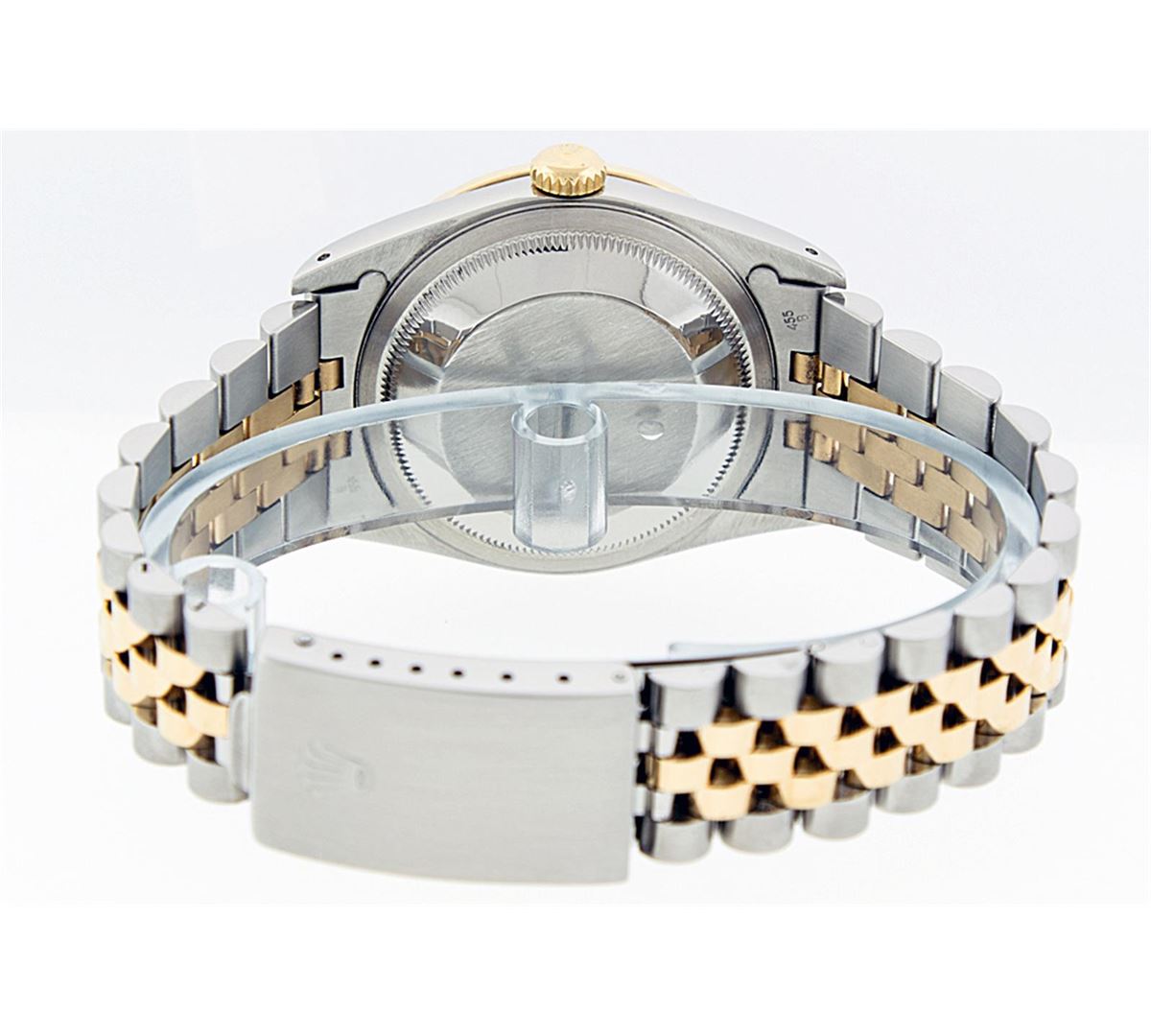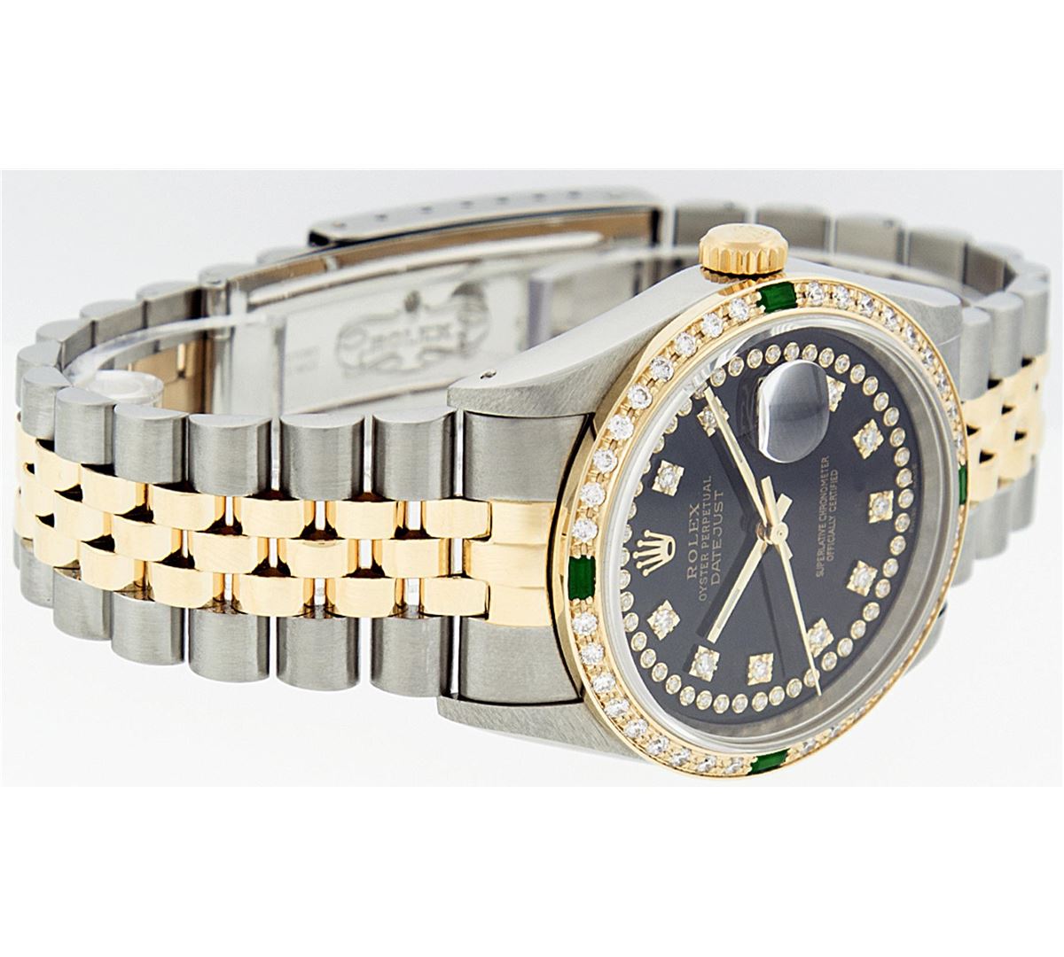 One Mens Two Tone Rolex Datejust Polished, Serviced & Electronically Tested, 14K Yellow Gold & Stainless Steel Case:36mm, 14K Yellow Gold Crown, Custom Bezel: 18K Yellow Gold Emerald Beadset Diamond Bezel, Diamond Count: 36 Diamonds + 4 Emeralds, Total Weight 1.00 Carat, Clarity: SI-VS, Color: G to H. Custom Crystal: Synthetic Sapphire Cyclops Lens. Movement: Automatic Winding Movement Caliber 3035. Custom Dial: Black String Diamond Dial VVS , Diamond Count: 58 Diamonds in Dial G To H In Color, VVS Clarity. Date Window: 3 O'Clock Position Date Display, Quickset, Model: 16013 Condition: G-6 Extra Fine. Bracelet: Two Tone 14K Yellow Gold & Stainless Steel Jubilee. Bright Polish. 7.0 Inch Length, Adjustable. Standard Clasp, With Rolex Logo. Comes with 6 month warranty.