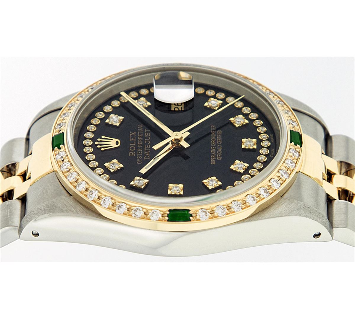 One Mens Two Tone Rolex Datejust Polished, Serviced & Electronically Tested, 14K Yellow Gold & Stainless Steel Case:36mm, 14K Yellow Gold Crown, Custom Bezel: 18K Yellow Gold Emerald Beadset Diamond Bezel, Diamond Count: 36 Diamonds + 4 Emeralds, Total Weight 1.00 Carat, Clarity: SI-VS, Color: G to H. Custom Crystal: Synthetic Sapphire Cyclops Lens. Movement: Automatic Winding Movement Caliber 3035. Custom Dial: Black String Diamond Dial VVS , Diamond Count: 58 Diamonds in Dial G To H In Color, VVS Clarity. Date Window: 3 O'Clock Position Date Display, Quickset, Model: 16013 Condition: G-6 Extra Fine. Bracelet: Two Tone 14K Yellow Gold & Stainless Steel Jubilee. Bright Polish. 7.0 Inch Length, Adjustable. Standard Clasp, With Rolex Logo. Comes with 6 month warranty.