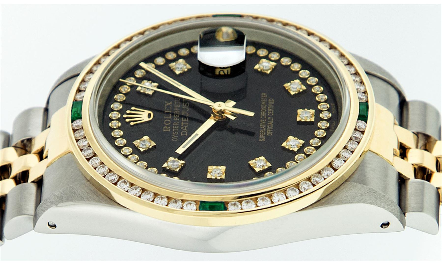 One Mens Two Tone Rolex Datejust Polished, Serviced & Electronically Tested, 14K Yellow Gold & Stainless Steel Case:36mm, 14K Yellow Gold Crown, Custom Bezel: 18K Yellow Gold Emerald Channel Set Diamond Bezel, Diamond Count: 52 Diamonds + 4 Emeralds, Total Weight 1.30 Carat, Clarity: SI-VS, Color: G to H. Custom Crystal: Synthetic Sapphire Cyclops Lens. Movement: Automatic Winding Movement Caliber 3035. Custom Dial: Black String Diamond Dial VVS , Diamond Count: 58 Diamonds in Dial G To H In Color, VVS Clarity. Date Window: 3 O'Clock Position Date Display, Quickset, Model: 16013 Condition: G-6 Extra Fine. Bracelet: Two Tone 14K Yellow Gold & Stainless Steel Jubilee. Bright Polish. 7.0 Inch Length, Adjustable. Standard Clasp, With Rolex Logo. Comes with 6 month warranty.