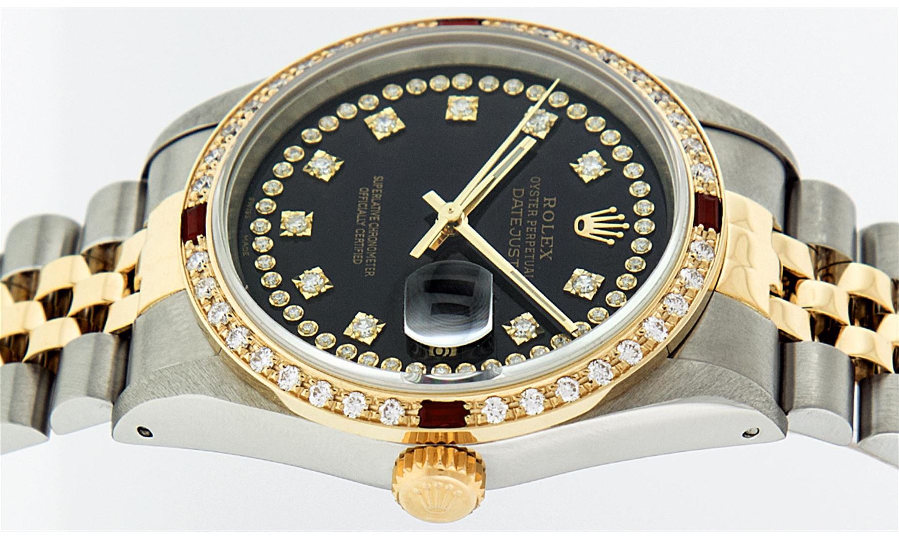 One Mens Two Tone Rolex Datejust Polished, Serviced & Electronically Tested, 14K Yellow Gold & Stainless Steel Case:36mm, 14K Yellow Gold Crown, Custom Bezel: 18K Yellow Gold Ruby Beadset Diamond Bezel, Diamond Count: 36 Diamonds + 4 Rubies, Total Weight 1.00 Carat, Clarity: SI-VS, Color: G to H. Custom Crystal: Synthetic Sapphire Cyclops Lens. Movement: Automatic Winding Movement Caliber 3035. Custom Dial: Black String Diamond Dial VVS , Diamond Count: 58 Diamonds in Dial G To H In Color, VVS Clarity. Date Window: 3 O'Clock Position Date Display, Quickset, Model: 16013 Condition: G-6 Extra Fine. Bracelet: Two Tone 14K Yellow Gold & Stainless Steel Jubilee. Bright Polish. 7.0 Inch Length, Adjustable. Standard Clasp, With Rolex Logo. Comes with 6 month warranty.