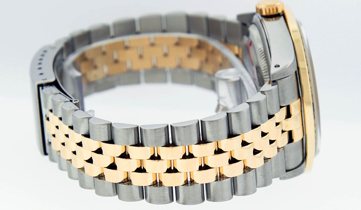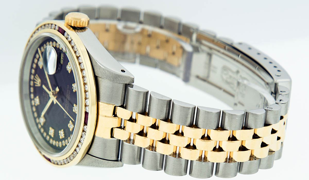 One Mens Two Tone Rolex Datejust Polished, Serviced & Electronically Tested, 14K Yellow Gold & Stainless Steel Case:36mm, 14K Yellow Gold Crown, Custom Bezel: 18K Yellow Gold Ruby Channel Set Diamond Bezel, Diamond Count: 52 Diamonds + 4 Ruby, Total Weight 1.30 Carat, Clarity: SI-VS, Color: G to H. Custom Crystal: Synthetic Sapphire Cyclops Lens. Movement: Automatic Winding Movement Caliber 3035. Custom Dial: Black String Diamond Dial VVS , Diamond Count: 58 Diamonds in Dial G To H In Color, VVS Clarity. Date Window: 3 O'Clock Position Date Display, Quickset, Model: 16013 Condition: G-6 Extra Fine. Bracelet: Two Tone 14K Yellow Gold & Stainless Steel Jubilee. Bright Polish. 7.0 Inch Length, Adjustable. Standard Clasp, With Rolex Logo. Comes with 6 month warranty.