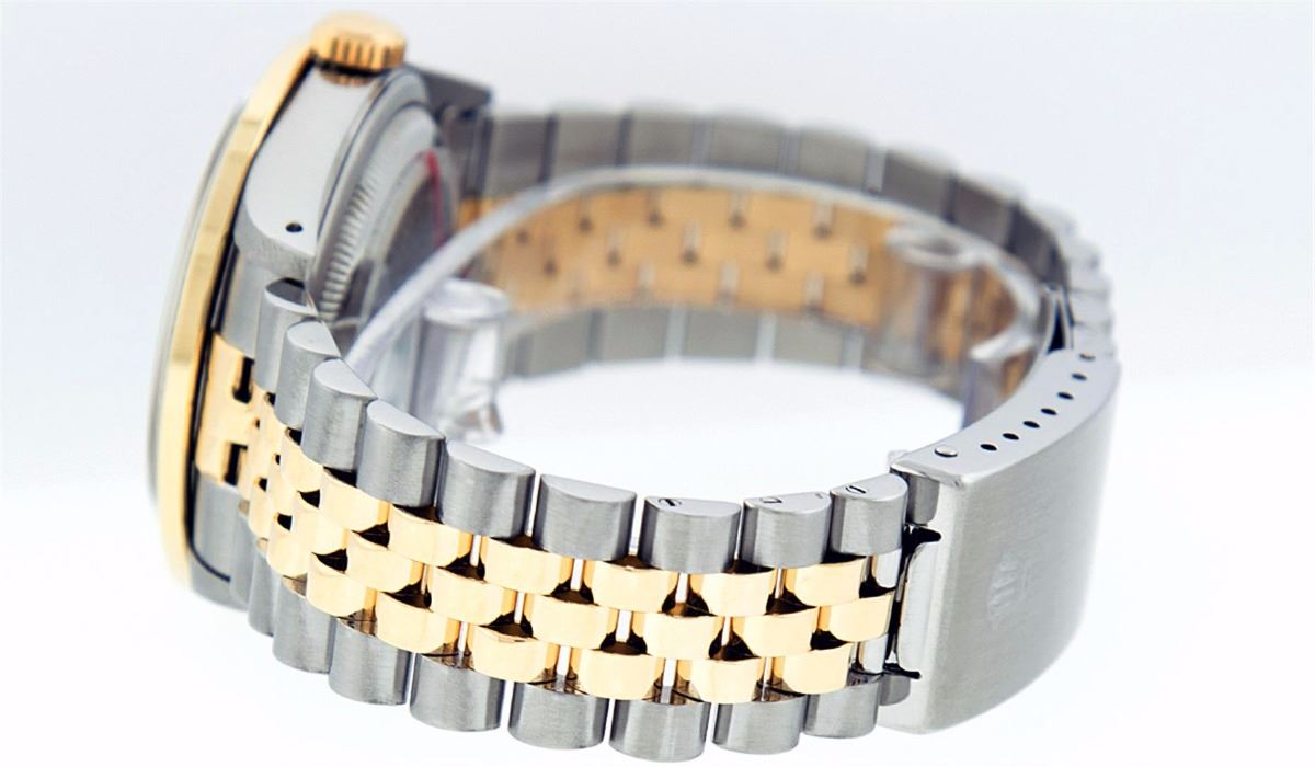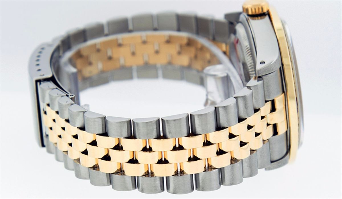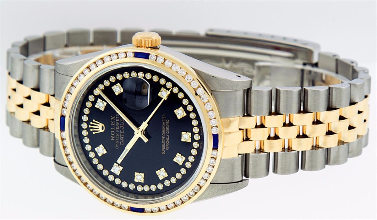One Mens Two Tone Rolex Datejust Polished, Serviced & Electronically Tested, 14K Yellow Gold & Stainless Steel Case:36mm, 14K Yellow Gold Crown, Custom Bezel: 18K Yellow Gold Sapphire Channel Set Diamond Bezel, Diamond Count: 52 Diamonds + 4 Sapphire, Total Weight 1.30 Carat, Clarity: SI-VS, Color: G to H. Custom Crystal: Synthetic Sapphire Cyclops Lens. Movement: Automatic Winding Movement Caliber 3035. Custom Dial: Black String Diamond Dial VVS , Diamond Count: 58 Diamonds in Dial G To H In Color, VVS Clarity. Date Window: 3 O'Clock Position Date Display, Quickset, Model: 16013 Condition: G-6 Extra Fine. Bracelet: Two Tone 14K Yellow Gold & Stainless Steel Jubilee. Bright Polish. 7.0 Inch Length, Adjustable. Standard Clasp, With Rolex Logo. Comes with 6 month warranty.