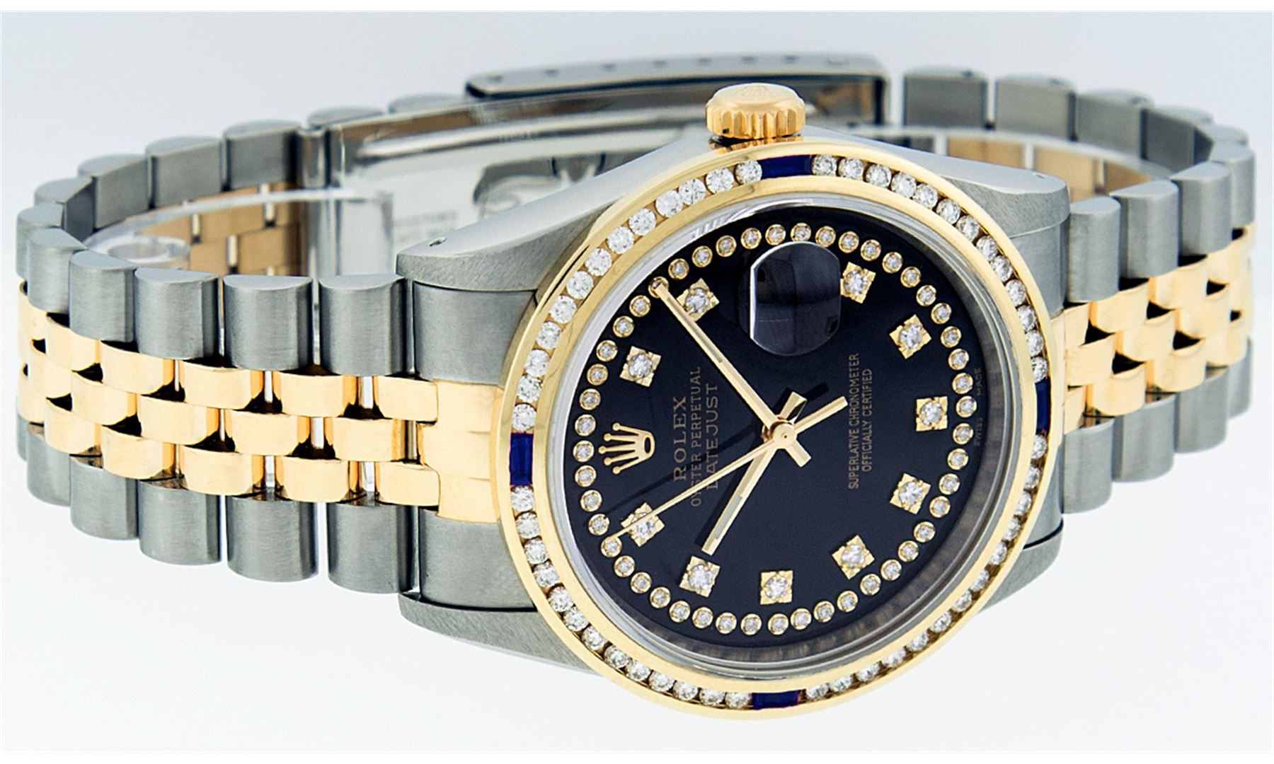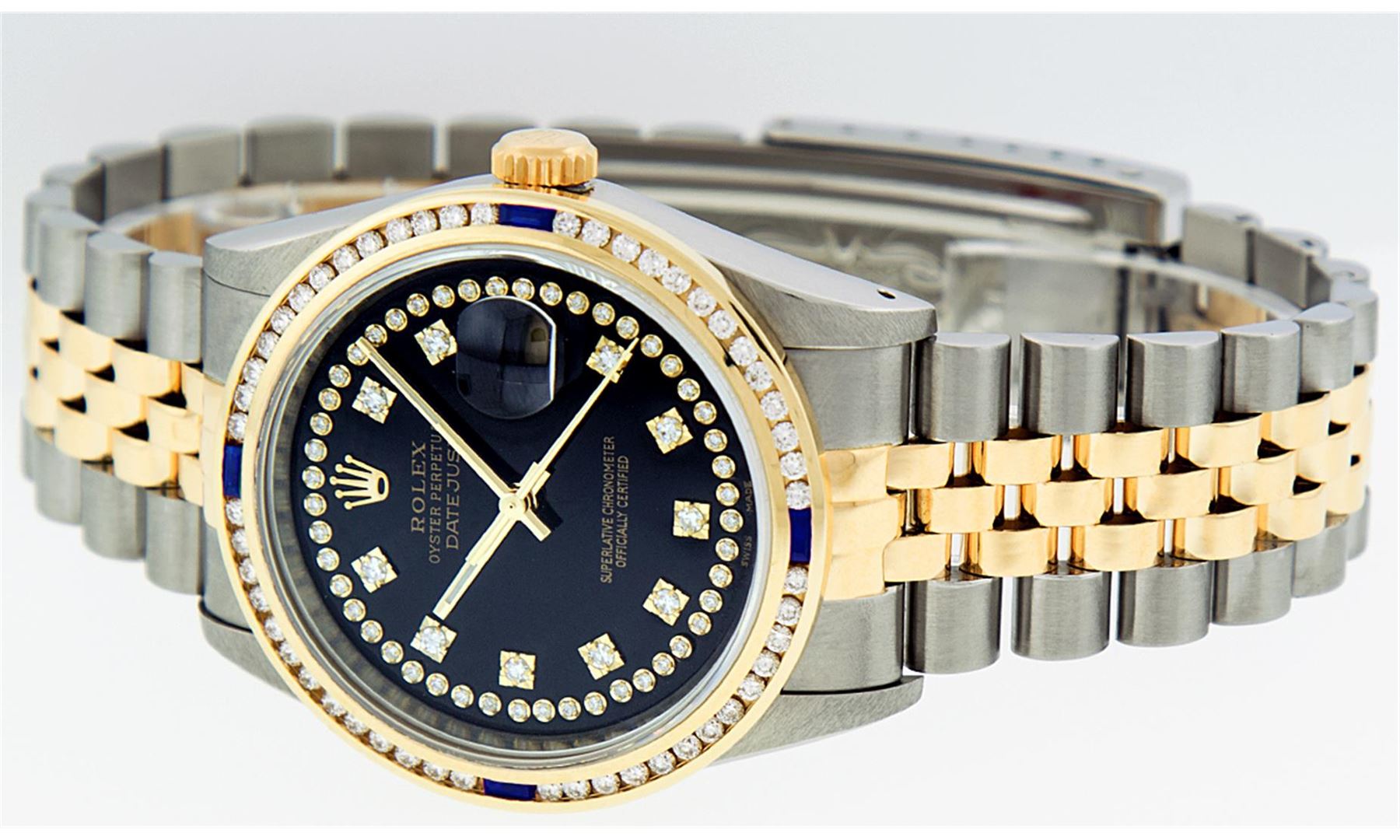 One Mens Two Tone Rolex Datejust Polished, Serviced & Electronically Tested, 14K Yellow Gold & Stainless Steel Case:36mm, 14K Yellow Gold Crown, Custom Bezel: 18K Yellow Gold Sapphire Channel Set Diamond Bezel, Diamond Count: 52 Diamonds + 4 Sapphire, Total Weight 1.30 Carat, Clarity: SI-VS, Color: G to H. Custom Crystal: Synthetic Sapphire Cyclops Lens. Movement: Automatic Winding Movement Caliber 3035. Custom Dial: Black String Diamond Dial VVS , Diamond Count: 58 Diamonds in Dial G To H In Color, VVS Clarity. Date Window: 3 O'Clock Position Date Display, Quickset, Model: 16013 Condition: G-6 Extra Fine. Bracelet: Two Tone 14K Yellow Gold & Stainless Steel Jubilee. Bright Polish. 7.0 Inch Length, Adjustable. Standard Clasp, With Rolex Logo. Comes with 6 month warranty.