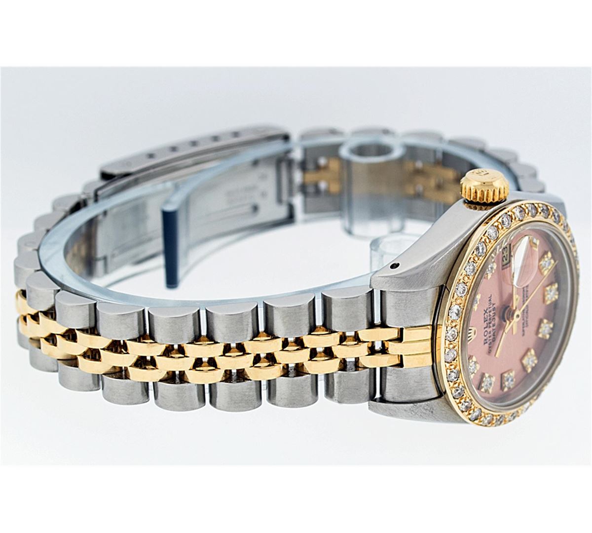 One Ladies Two Tone Rolex Datejust Polished, Serviced & Electronically Tested, 14K Yellow Gold & Stainless Steel Case:26mm, 14K Yellow Gold Crown, Custom Bezel: 18K Yellow Gold Beadset Diamond Bezel, Stone Count: 32 Diamonds, Total Weight .70 Carat, Clarity: Si-VS, Color: G to H. Custom Crystal: Synthetic Sapphire Cyclops Lens. Movement: Automatic Winding Movement Caliber 2030. Custom Dial: Salmon Diamond Dial VVS, Stone Count: 10 Diamonds in Dial, Color: G to H, Clarity: VVS. Date Window: 3 O'Clock Position Date Display, Model: Datejust, Condition: G-6 Extra Fine. Bracelet: Two Tone 14K Yellow Gold & Stainless Steel Jubilee. Bright Polish. 5.5 Inch Length, Adjustable. Standard Clasp, With Rolex Logo. Comes with a 6 month warranty card.