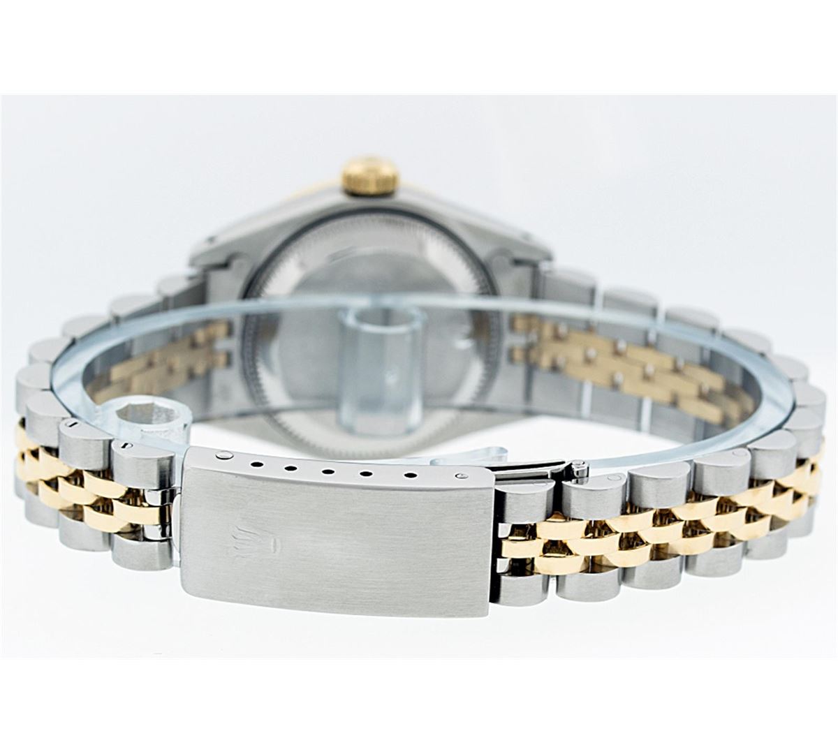 One Ladies Two Tone Rolex Datejust Polished, Serviced & Electronically Tested, 14K Yellow Gold & Stainless Steel Case:26mm, 14K Yellow Gold Crown, Custom Bezel: 18K Yellow Gold Beadset Diamond Bezel, Stone Count: 32 Diamonds, Total Weight .70 Carat, Clarity: Si-VS, Color: G to H. Custom Crystal: Synthetic Sapphire Cyclops Lens. Movement: Automatic Winding Movement Caliber 2030. Custom Dial: Salmon Diamond Dial VVS, Stone Count: 10 Diamonds in Dial, Color: G to H, Clarity: VVS. Date Window: 3 O'Clock Position Date Display, Model: Datejust, Condition: G-6 Extra Fine. Bracelet: Two Tone 14K Yellow Gold & Stainless Steel Jubilee. Bright Polish. 5.5 Inch Length, Adjustable. Standard Clasp, With Rolex Logo. Comes with a 6 month warranty card.
