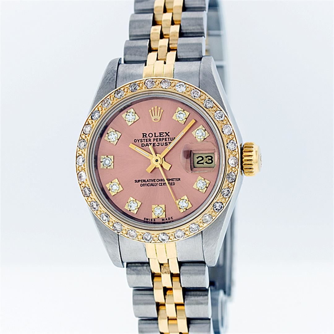 One Ladies Two Tone Rolex Datejust Polished, Serviced & Electronically Tested, 14K Yellow Gold & Stainless Steel Case:26mm, 14K Yellow Gold Crown, Custom Bezel: 18K Yellow Gold Beadset Diamond Bezel, Stone Count: 32 Diamonds, Total Weight .70 Carat, Clarity: Si-VS, Color: G to H. Custom Crystal: Synthetic Sapphire Cyclops Lens. Movement: Automatic Winding Movement Caliber 2030. Custom Dial: Salmon Diamond Dial VVS, Stone Count: 10 Diamonds in Dial, Color: G to H, Clarity: VVS. Date Window: 3 O'Clock Position Date Display, Model: Datejust, Condition: G-6 Extra Fine. Bracelet: Two Tone 14K Yellow Gold & Stainless Steel Jubilee. Bright Polish. 5.5 Inch Length, Adjustable. Standard Clasp, With Rolex Logo. Comes with a 6 month warranty card.