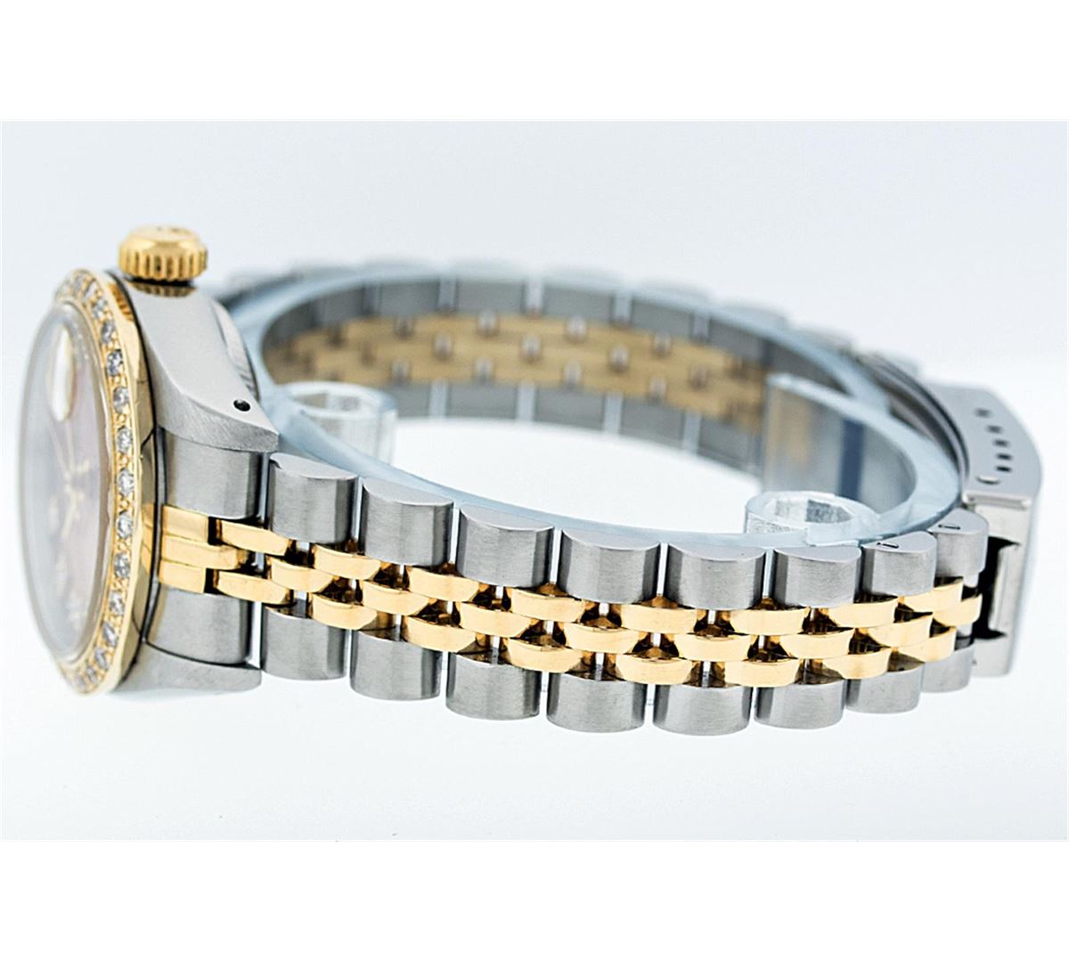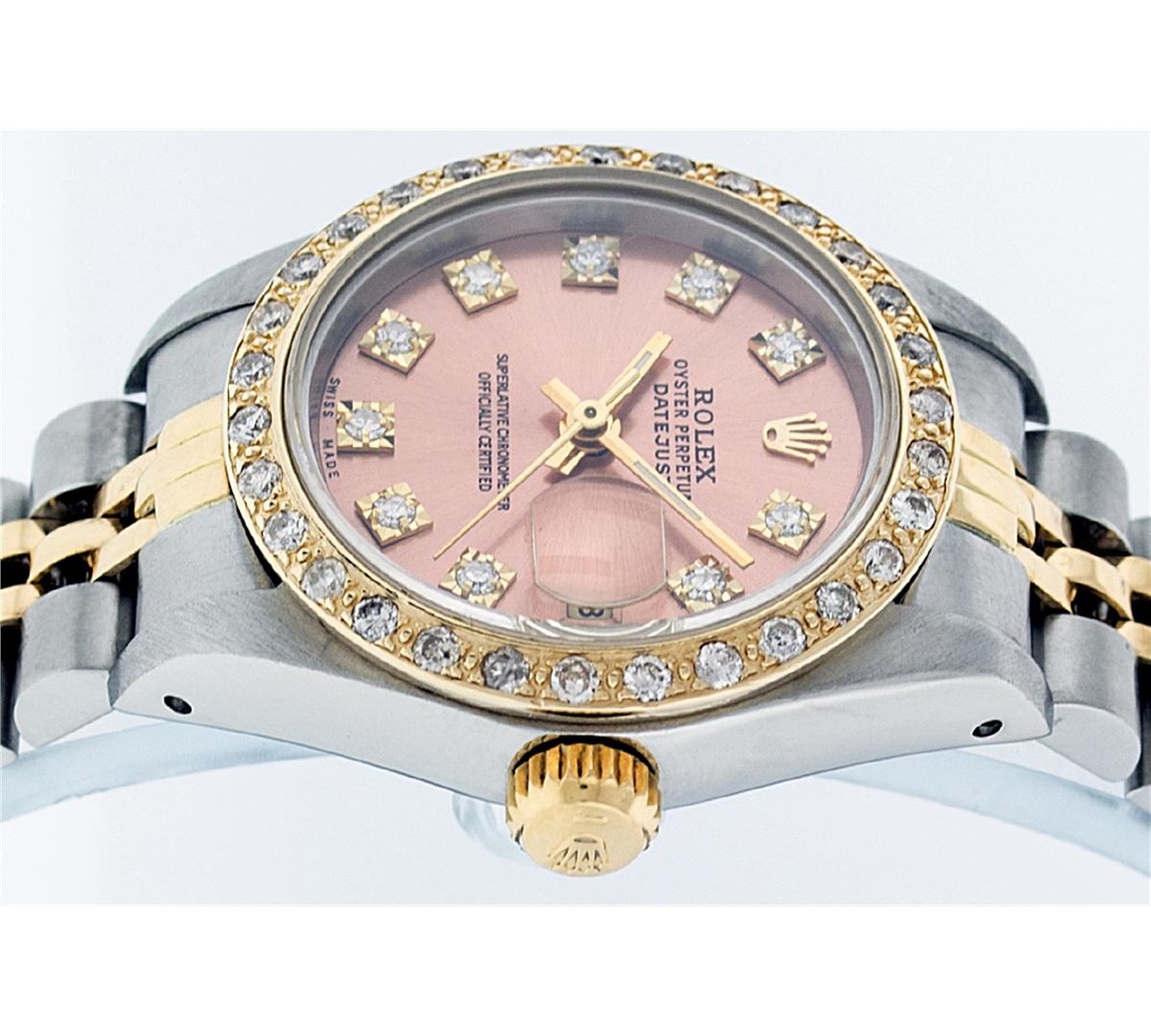 One Ladies Two Tone Rolex Datejust Polished, Serviced & Electronically Tested, 14K Yellow Gold & Stainless Steel Case:26mm, 14K Yellow Gold Crown, Custom Bezel: 18K Yellow Gold Beadset Diamond Bezel, Stone Count: 32 Diamonds, Total Weight .70 Carat, Clarity: Si-VS, Color: G to H. Custom Crystal: Synthetic Sapphire Cyclops Lens. Movement: Automatic Winding Movement Caliber 2030. Custom Dial: Salmon Diamond Dial VVS, Stone Count: 10 Diamonds in Dial, Color: G to H, Clarity: VVS. Date Window: 3 O'Clock Position Date Display, Model: Datejust, Condition: G-6 Extra Fine. Bracelet: Two Tone 14K Yellow Gold & Stainless Steel Jubilee. Bright Polish. 5.5 Inch Length, Adjustable. Standard Clasp, With Rolex Logo. Comes with a 6 month warranty card.