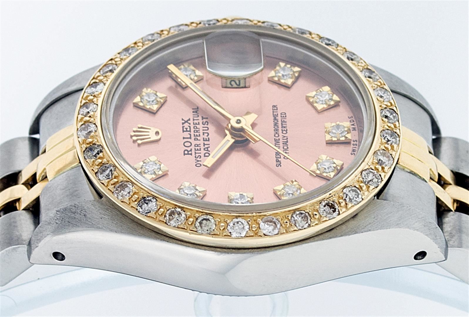 One Ladies Two Tone Rolex Datejust Polished, Serviced & Electronically Tested, 14K Yellow Gold & Stainless Steel Case:26mm, 14K Yellow Gold Crown, Custom Bezel: 18K Yellow Gold Beadset Diamond Bezel, Stone Count: 32 Diamonds, Total Weight .70 Carat, Clarity: Si-VS, Color: G to H. Custom Crystal: Synthetic Sapphire Cyclops Lens. Movement: Automatic Winding Movement Caliber 2030. Custom Dial: Salmon Diamond Dial VVS, Stone Count: 10 Diamonds in Dial, Color: G to H, Clarity: VVS. Date Window: 3 O'Clock Position Date Display, Model: Datejust, Condition: G-6 Extra Fine. Bracelet: Two Tone 14K Yellow Gold & Stainless Steel Jubilee. Bright Polish. 5.5 Inch Length, Adjustable. Standard Clasp, With Rolex Logo. Comes with a 6 month warranty card.