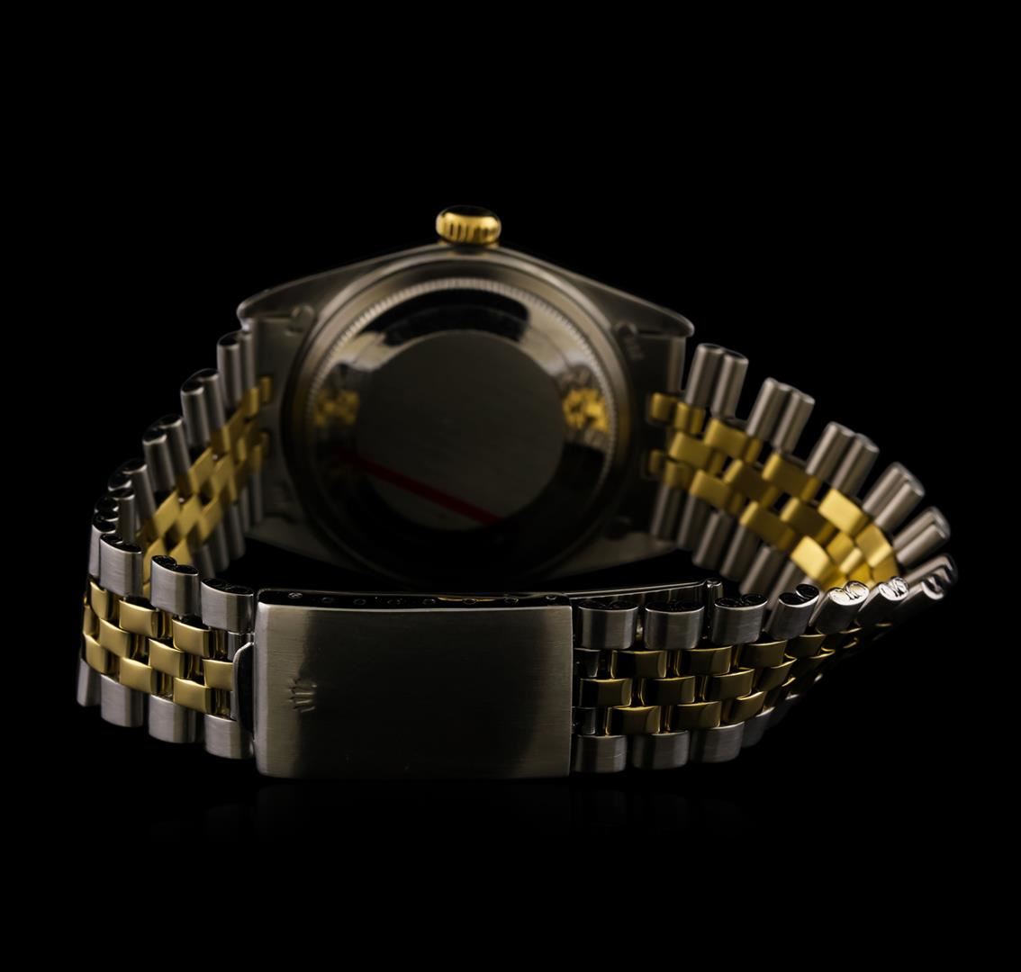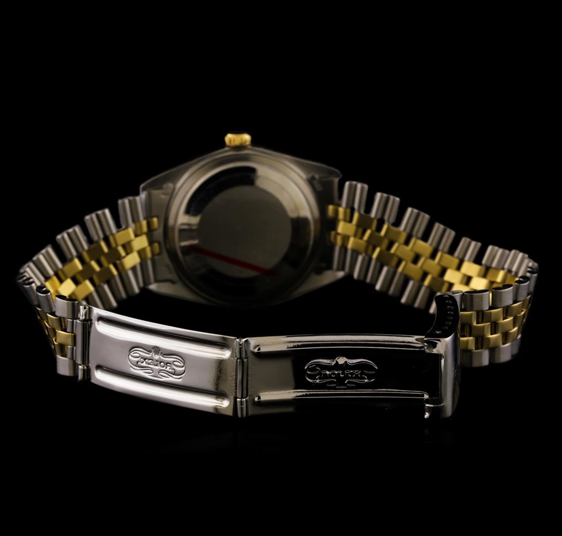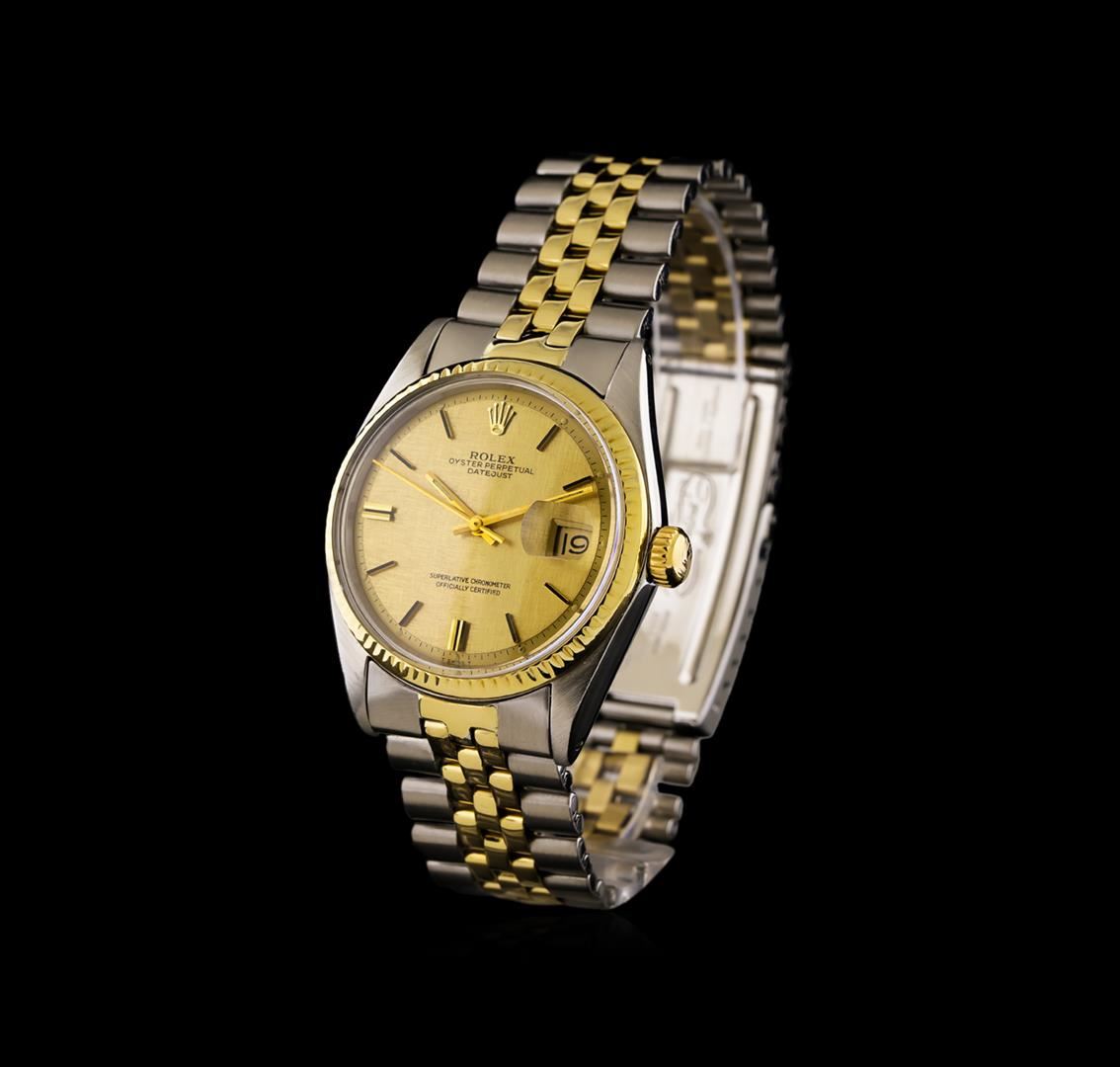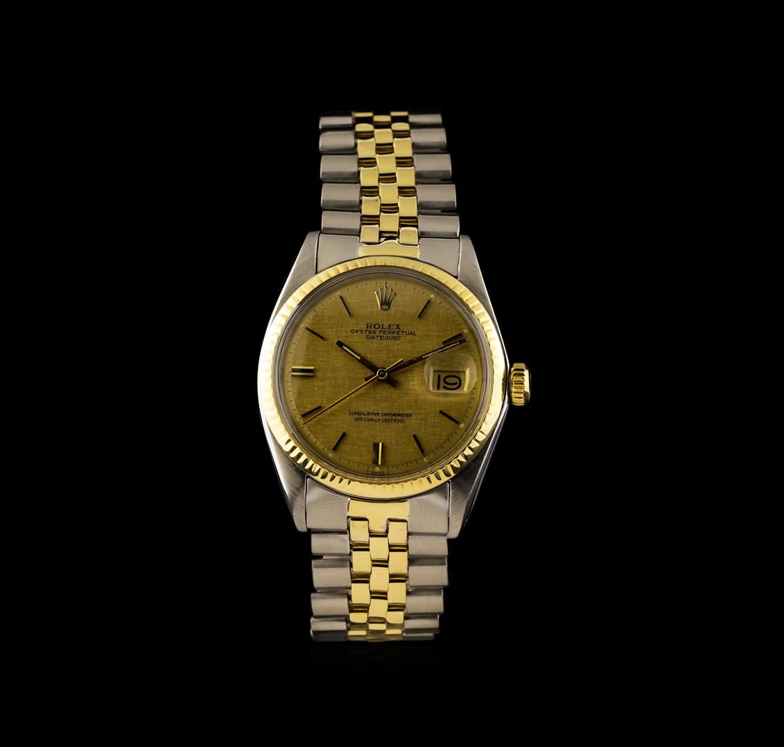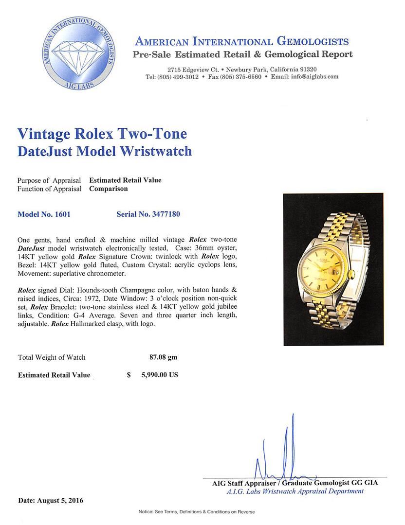 One gents, hand crafted & machine milled vintage Rolex two-tone DateJust model wristwatch electronically tested, Case: 36mm oyster, 14KT yellow gold Rolex Signature Crown: twinlock with Rolex logo, Bezel: 14KT yellow gold fluted, Custom Crystal: acrylic cyclops lens, Movement: superlative chronometer. Rolex signed Dial: Hounds-tooth Champagne color, with baton hands & raised indices, Circa: 1972, Date Window: 3 o'clock position non-quick set, Rolex Bracelet: two-tone stainless steel & 14KT yellow gold jubilee links, Condition: G-4 Average. Seven and three quarter inch length, adjustable. Rolex Hallmarked clasp, with logo. Total Weight of Watch 87.08gm. AIG Appraised at $5,990.00.