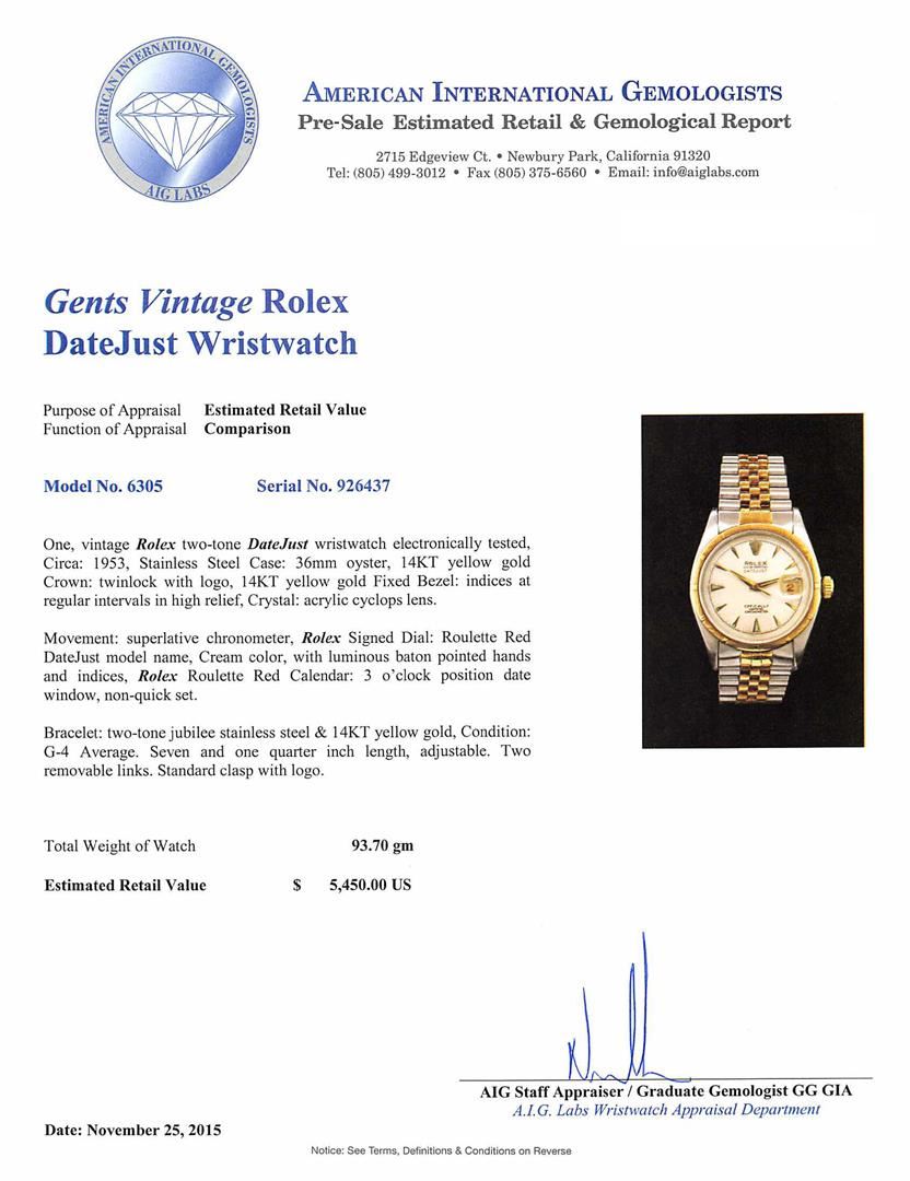 One, vintage Rolex two-tone DateJust wristwatch electronically tested, Circa: 1953, Stainless Steel Case: 36mm oyster, 14KT yellow gold Crown: twinlock with logo, 14KT yellow gold Fixed Bezel: indices at regular intervals in high relief, Crystal: acrylic cyclops lens. Movement: superlative chronometer, Rolex Signed Dial: Roulette Red DateJust model name, Cream color, with luminous baton pointed hands and indices, Rolex Roulette Red Calendar: 3 o'clock position date window, non-quick set. Bracelet: two-tone jubilee stainless steel & 14KT yellow gold, Condition: G-4 Average. Seven and one quarter inch length, adjustable. Two removable links. Standard clasp with logo. Total Weight of Watch 93.70gm. AIG Appraised at $5,450.00.