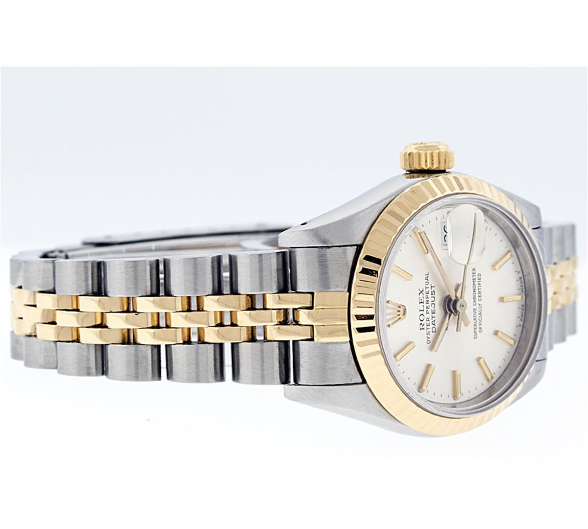 One Ladies Two Tone Rolex Datejust Polished, Serviced & Electronically Tested, 14K Yellow Gold & Stainless Steel Case:26mm, 14K Yellow Gold Crown, Bezel: 14K Yellow Gold Fluted Bezel. Custom Crystal: Acrylic Cyclops Lens. Movement: Automatic Winding Movement Caliber 2030. Custom Dial: White Index With Lumi Dots And Small Track. Date Window: 3 O'Clock Position Date Display, Model: Datejust. Condition: G-6 Extra Fine. Bracelet: Two Tone 14K Yellow Gold & Stainless Steel Jubilee Band. Bright Polish. 5.5 Inch Length, Adjustable. Standard Clasp, With Rolex Logo. Comes with a 6 month warranty card.