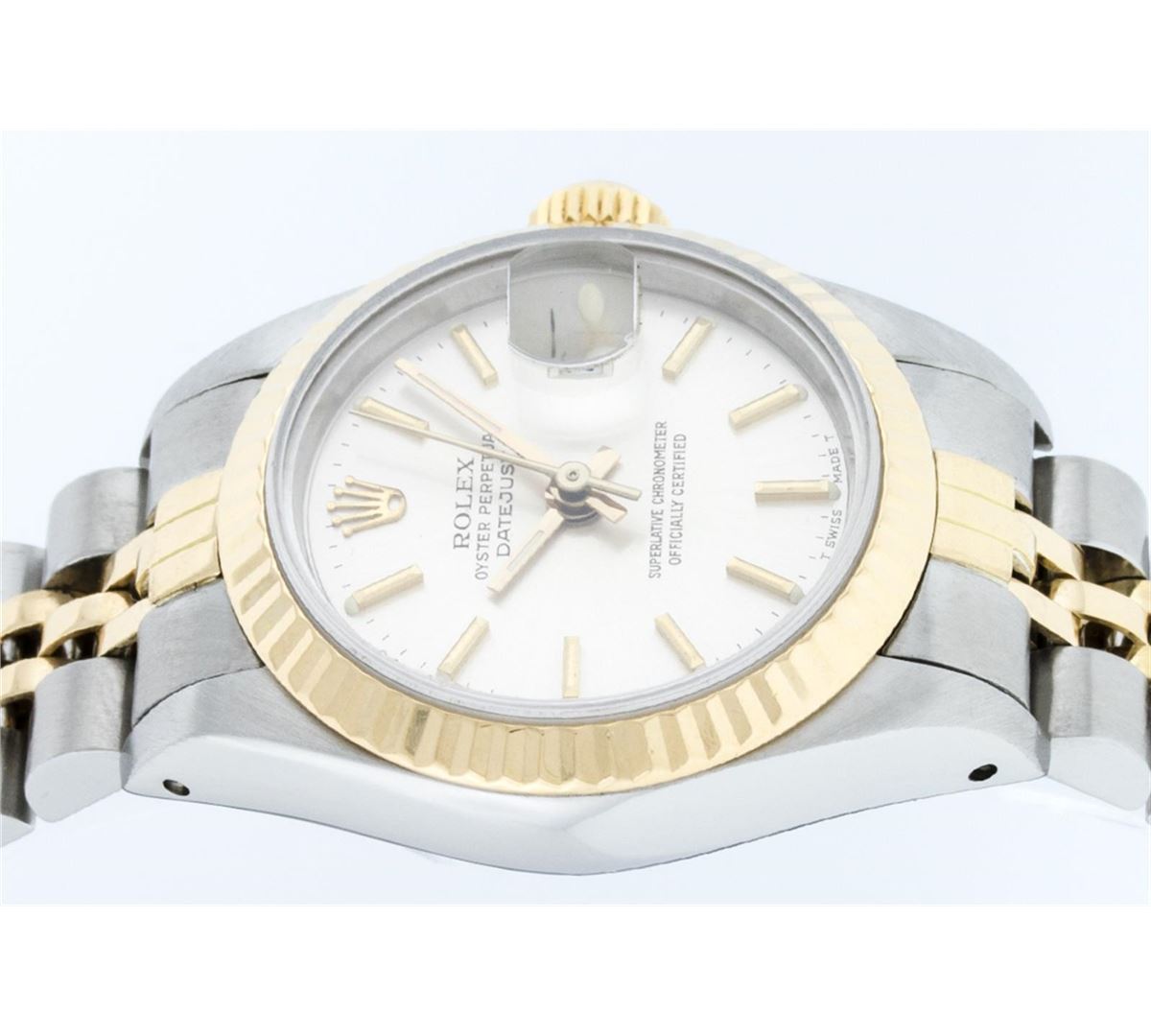 One Ladies Two Tone Rolex Datejust Polished, Serviced & Electronically Tested, 14K Yellow Gold & Stainless Steel Case:26mm, 14K Yellow Gold Crown, Bezel: 14K Yellow Gold Fluted Bezel. Custom Crystal: Acrylic Cyclops Lens. Movement: Automatic Winding Movement Caliber 2030. Custom Dial: White Index With Lumi Dots And Small Track. Date Window: 3 O'Clock Position Date Display, Model: Datejust. Condition: G-6 Extra Fine. Bracelet: Two Tone 14K Yellow Gold & Stainless Steel Jubilee Band. Bright Polish. 5.5 Inch Length, Adjustable. Standard Clasp, With Rolex Logo. Comes with a 6 month warranty card.