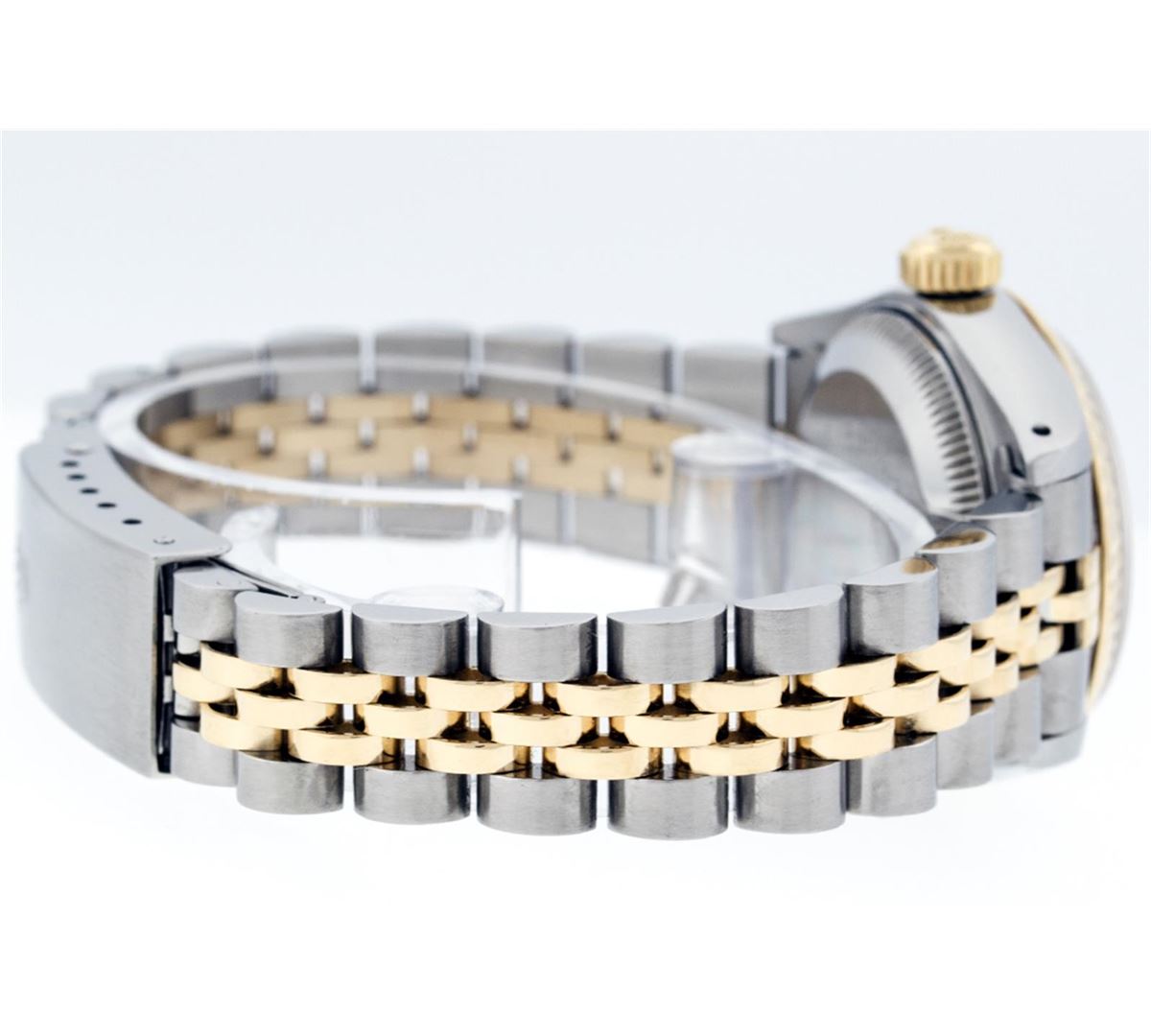 One Ladies Two Tone Rolex Datejust Polished, Serviced & Electronically Tested, 14K Yellow Gold & Stainless Steel Case:26mm, 14K Yellow Gold Crown, Bezel: 14K Yellow Gold Fluted Bezel. Custom Crystal: Acrylic Cyclops Lens. Movement: Automatic Winding Movement Caliber 2030. Custom Dial: White Index With Lumi Dots And Small Track. Date Window: 3 O'Clock Position Date Display, Model: Datejust. Condition: G-6 Extra Fine. Bracelet: Two Tone 14K Yellow Gold & Stainless Steel Jubilee Band. Bright Polish. 5.5 Inch Length, Adjustable. Standard Clasp, With Rolex Logo. Comes with a 6 month warranty card.
