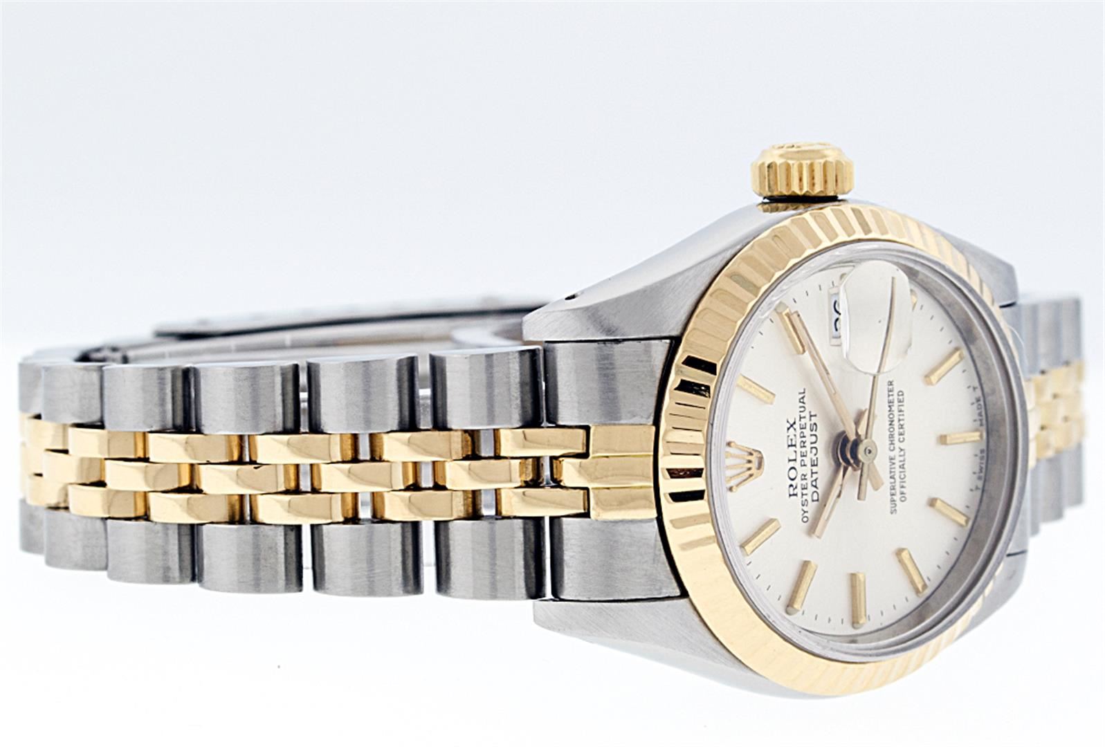 One Ladies Two Tone Rolex Datejust Polished, Serviced & Electronically Tested, 14K Yellow Gold & Stainless Steel Case:26mm, 14K Yellow Gold Crown, Bezel: 14K Yellow Gold Fluted Bezel. Custom Crystal: Acrylic Cyclops Lens. Movement: Automatic Winding Movement Caliber 2030. Custom Dial: White Index With Lumi Dots And Small Track. Date Window: 3 O'Clock Position Date Display, Model: Datejust. Condition: G-6 Extra Fine. Bracelet: Two Tone 14K Yellow Gold & Stainless Steel Jubilee Band. Bright Polish. 5.5 Inch Length, Adjustable. Standard Clasp, With Rolex Logo. Comes with a 6 month warranty card.