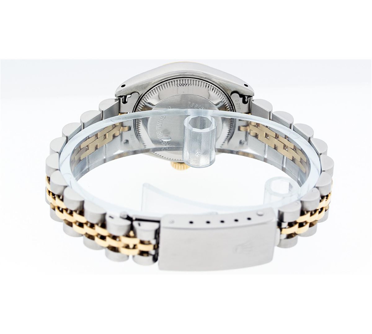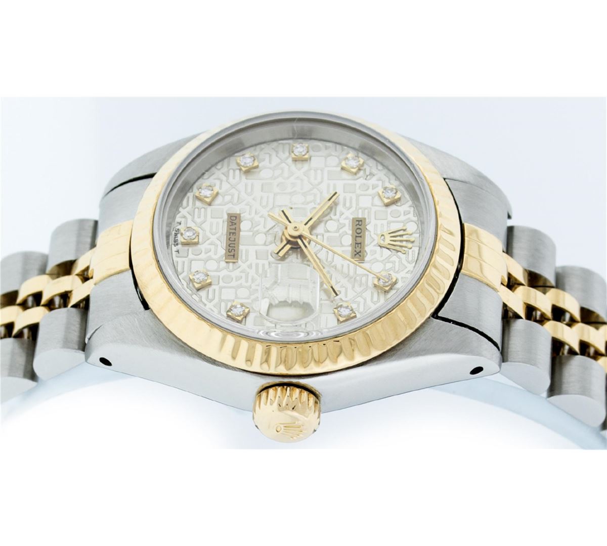 One Ladies Two Tone Rolex Datejust Polished, Serviced & Electronically Tested, 14K Yellow Gold & Stainless Steel Case:26mm,14K Yellow Gold Crown, Bezel: 14K Yellow Gold Fluted Bezel. Custom Crystal: Acrylic Cyclops Lens. Movement: Automatic Winding Movement Caliber 2030. Custom Dial: White Jubilee Diamond Hour Markers, Diamond Count: 10 Diamonds, Color: G to H, Clarity: VS2-SI1. Date Window: 3 O'Clock Position Date Display, Model: Datejust. Condition: G-6 Extra Fine. Bracelet: Two Tone 14K Yellow Gold & Stainless Steel Jubilee. Bright Polish. 5.5 Inch Length, Adjustable. Standard Clasp, With Rolex Logo. Comes with a 6 month warranty card.