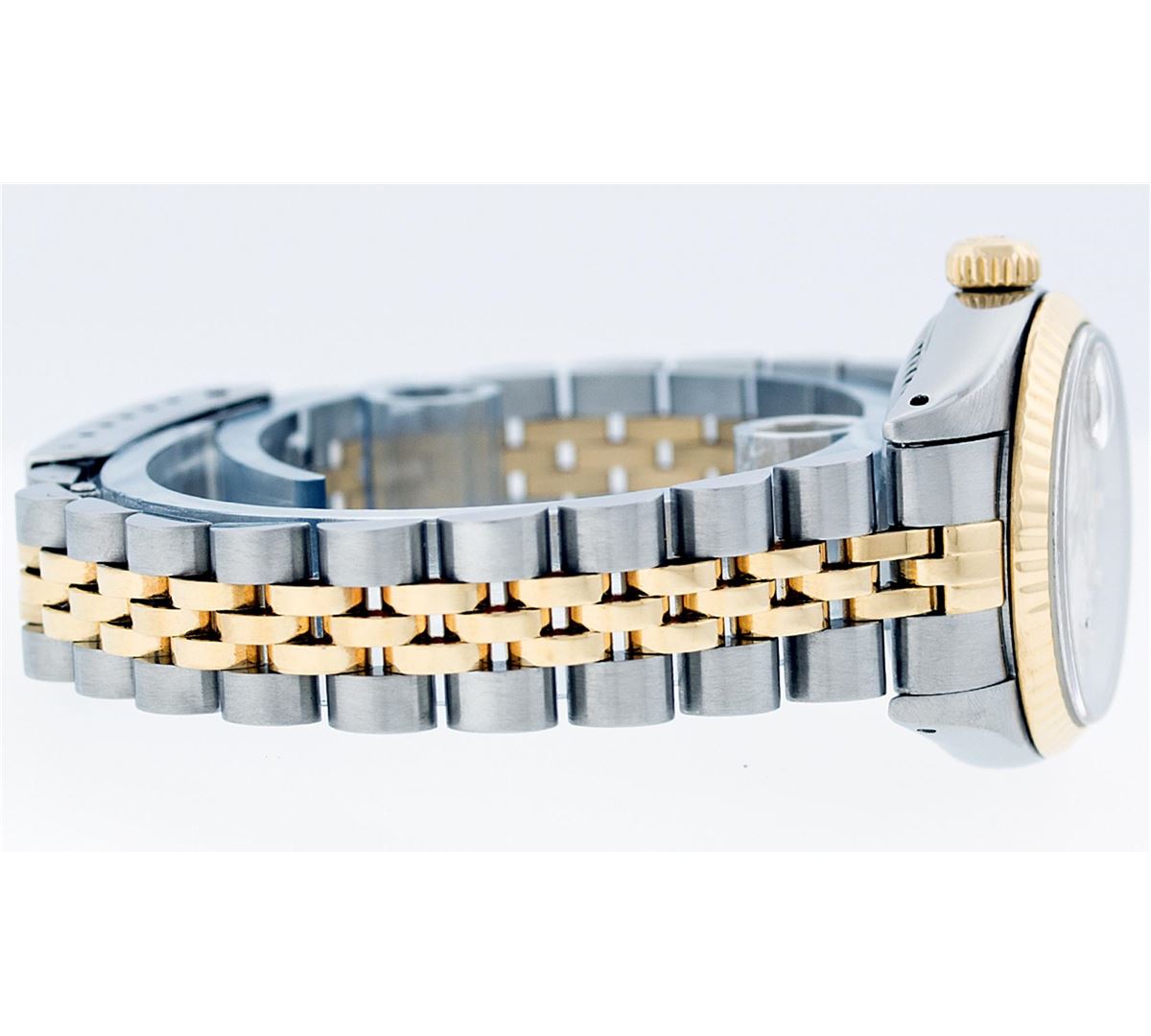 One Ladies Two Tone Rolex Datejust Polished, Serviced & Electronically Tested, 14K Yellow Gold & Stainless Steel Case:26mm,14K Yellow Gold Crown, Bezel: 14K Yellow Gold Fluted Bezel. Custom Crystal: Acrylic Cyclops Lens. Movement: Automatic Winding Movement Caliber 2030. Custom Dial: White Jubilee Diamond Hour Markers, Diamond Count: 10 Diamonds, Color: G to H, Clarity: VS2-SI1. Date Window: 3 O'Clock Position Date Display, Model: Datejust. Condition: G-6 Extra Fine. Bracelet: Two Tone 14K Yellow Gold & Stainless Steel Jubilee. Bright Polish. 5.5 Inch Length, Adjustable. Standard Clasp, With Rolex Logo. Comes with a 6 month warranty card.