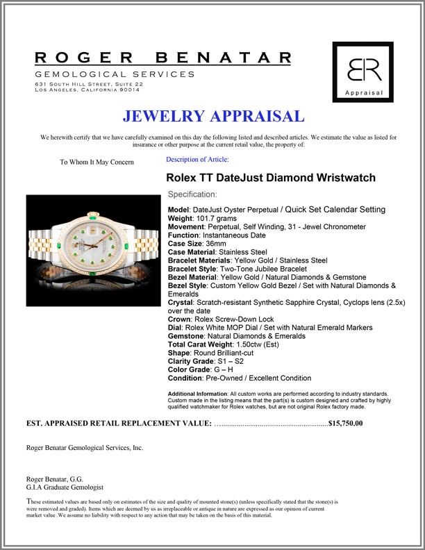 Dial: Rolex White MOP Dial / Set with Natural Emerald Markers