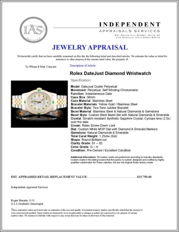 Dial: Custom White MOP Dial with Diamond & Emerald Markers