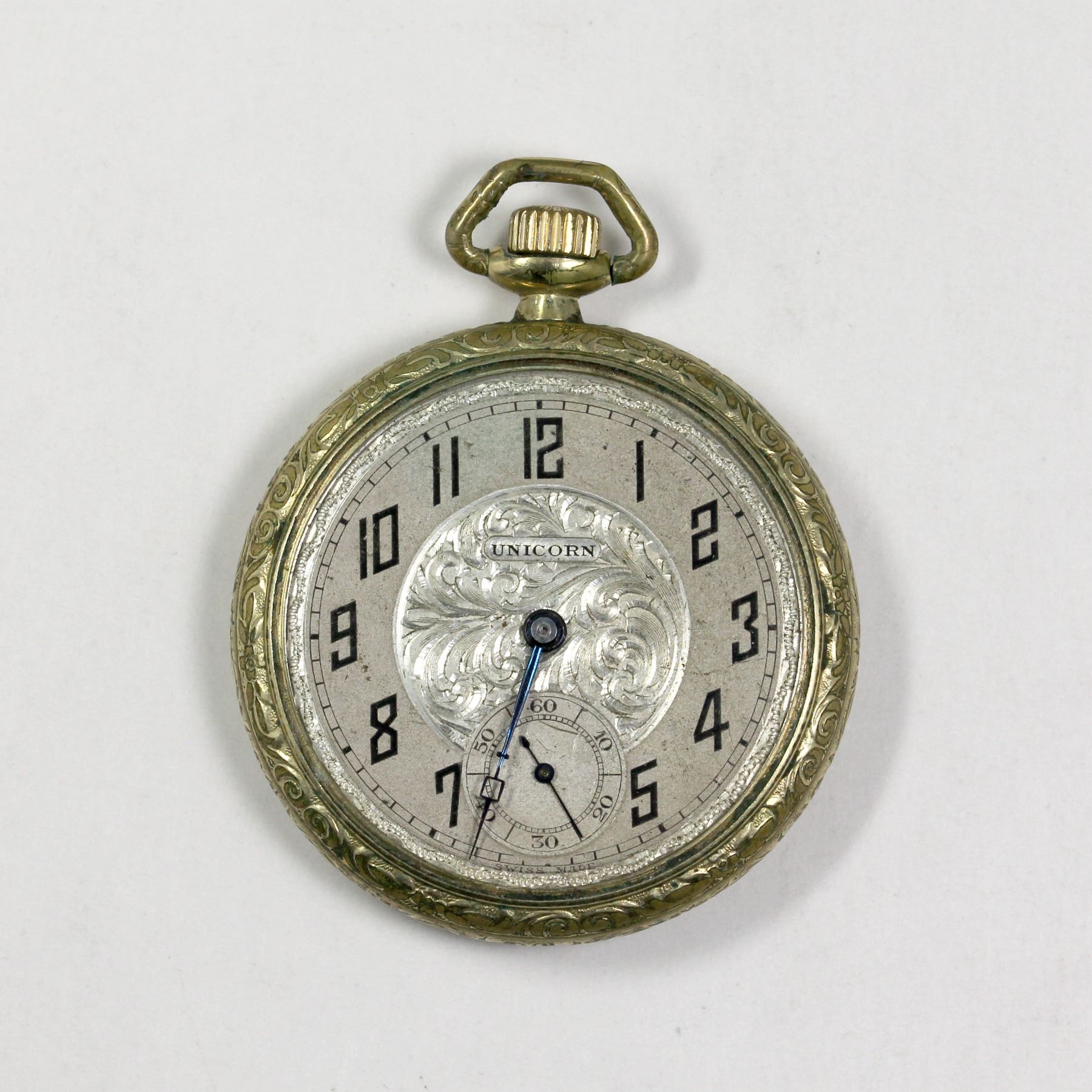 Swiss. 1920s. Unicorn was a brand owned by Rolex. Cases: Gold filled. Marked, "Derby M.W.C Co. Case Made in Canada". 12 size (40mm movement diameter). 15 jewels, 3 adjustments. Running. Missing hour hand and crystal. Running watches have not been tested for timekeeping accuracy and may require adjustment. The fact that a watch has been described as "running" provides no guarantee of its ability to continue to do so.