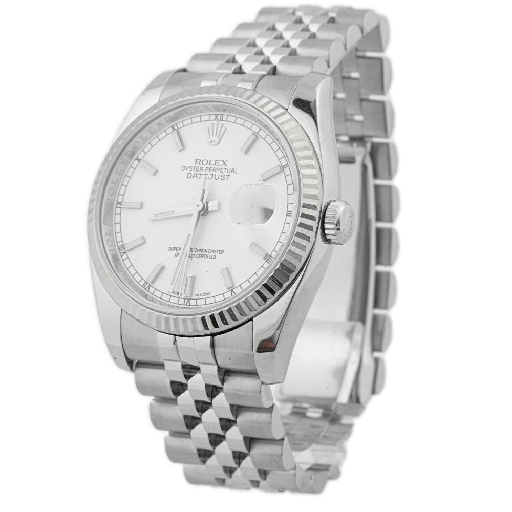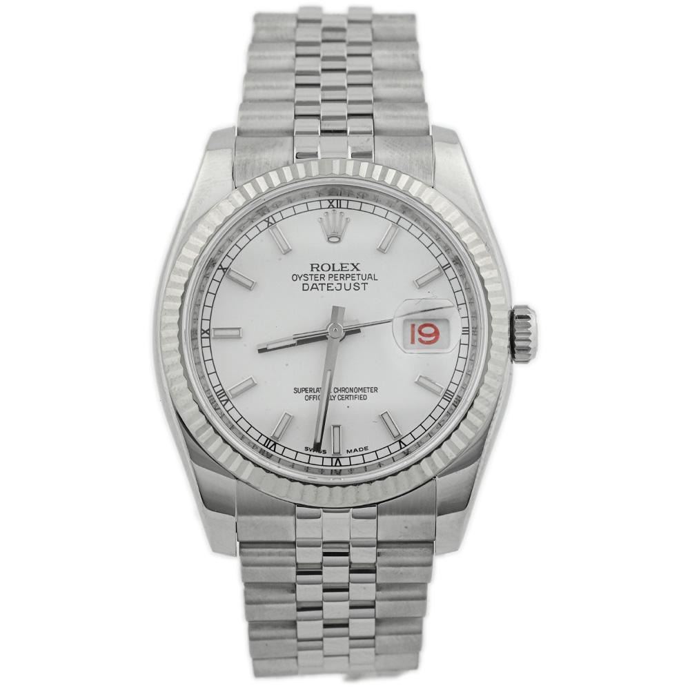 Model: Datejust 36. Reference #: 116234. Case: Stainless Steel. Case Size: 36mm. Bracelet: Jubilee Bracelet. Dial: White Dial w/ Stick Hour Markers. Bezel: Fluted Bezel. Date Window: 3 O'clock Position w/ Cyclops lens. Features Roulette Date Window; Red Odd Numbers, Black Even Numbers. Movement: Automatic Winding Movement . Water Resistant: Yes 100 Meters/330 Feet. Crystal: Scratch Resistant Sapphire Crystal. Condition: Pre-Owned. Box Included. CIRCA: 2008. All Pre-Owned watches are guaranteed to be 100% genuine. Your watch will come with a 2-year limited warranty, original box, and appraisal.