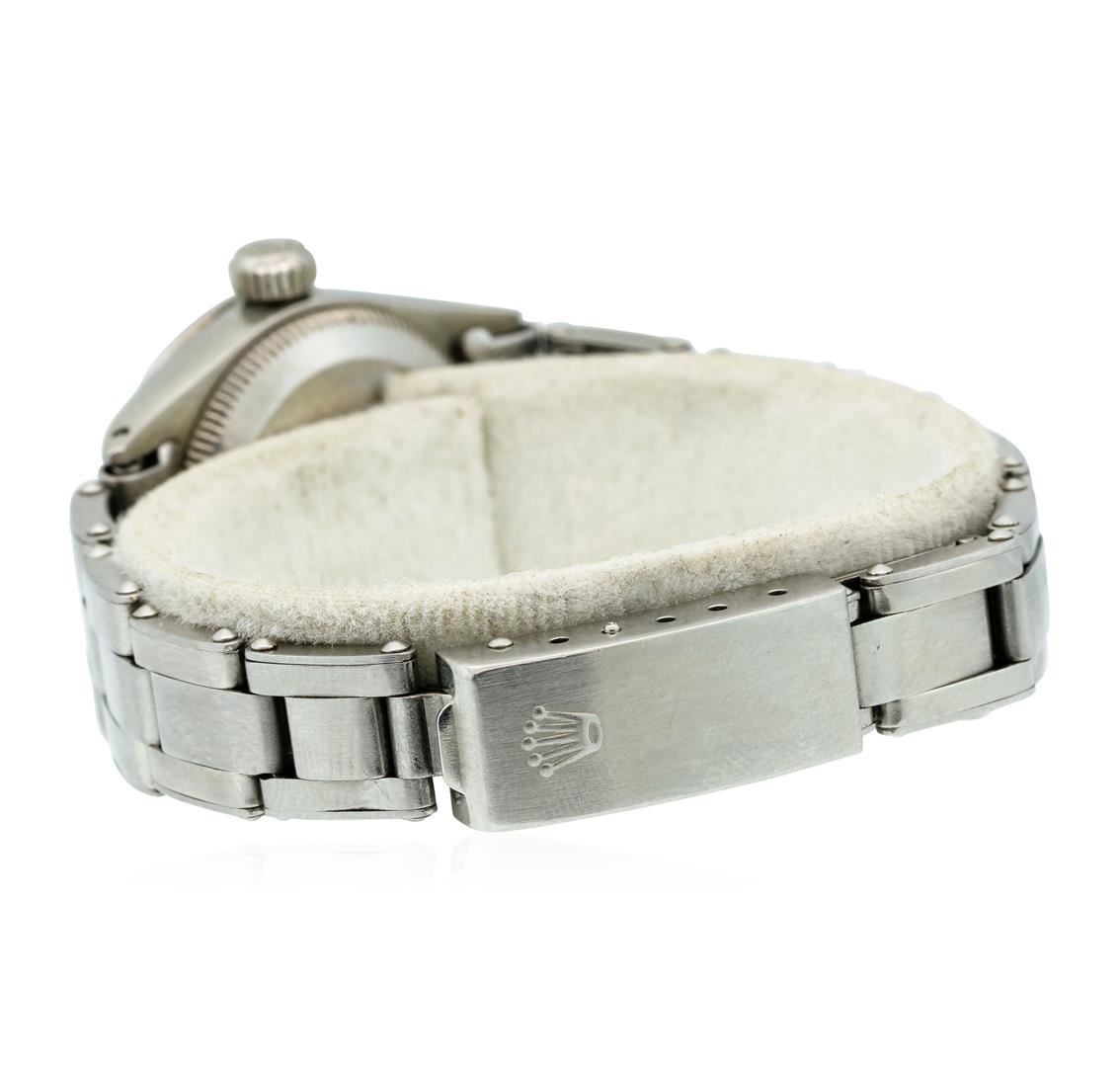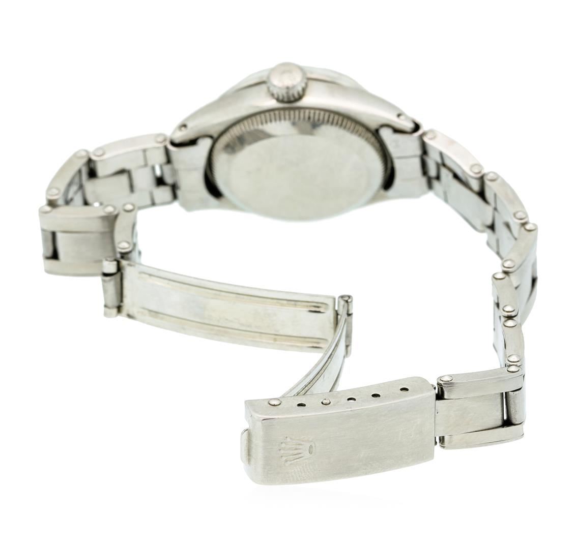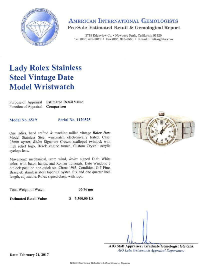 One ladies hand crafted & machine milled vintage Rolex Date Model Stainless Steel wristwatch electronically tested, Case: 25mm oyster, Rolex Signature Crown: scalloped twinlock with high relief logo, Bezel: engine turned, Custom Crystal: acrylic cyclops lens.Movement: mechanical, stem wind, Rolex signed Dial: White color, with baton hands, and Roman numerals, Date Window: 3 o'clock position non-quick set, Circa: 1965, Condition: G-5 Fine. Bracelet: stainless steel tapering oyster. Six and one quarter inch length, adjustable. Rolex signed clasp, with logo.Total Weight of Watch 36.76gm. AIG Appraised at $3,300.00.