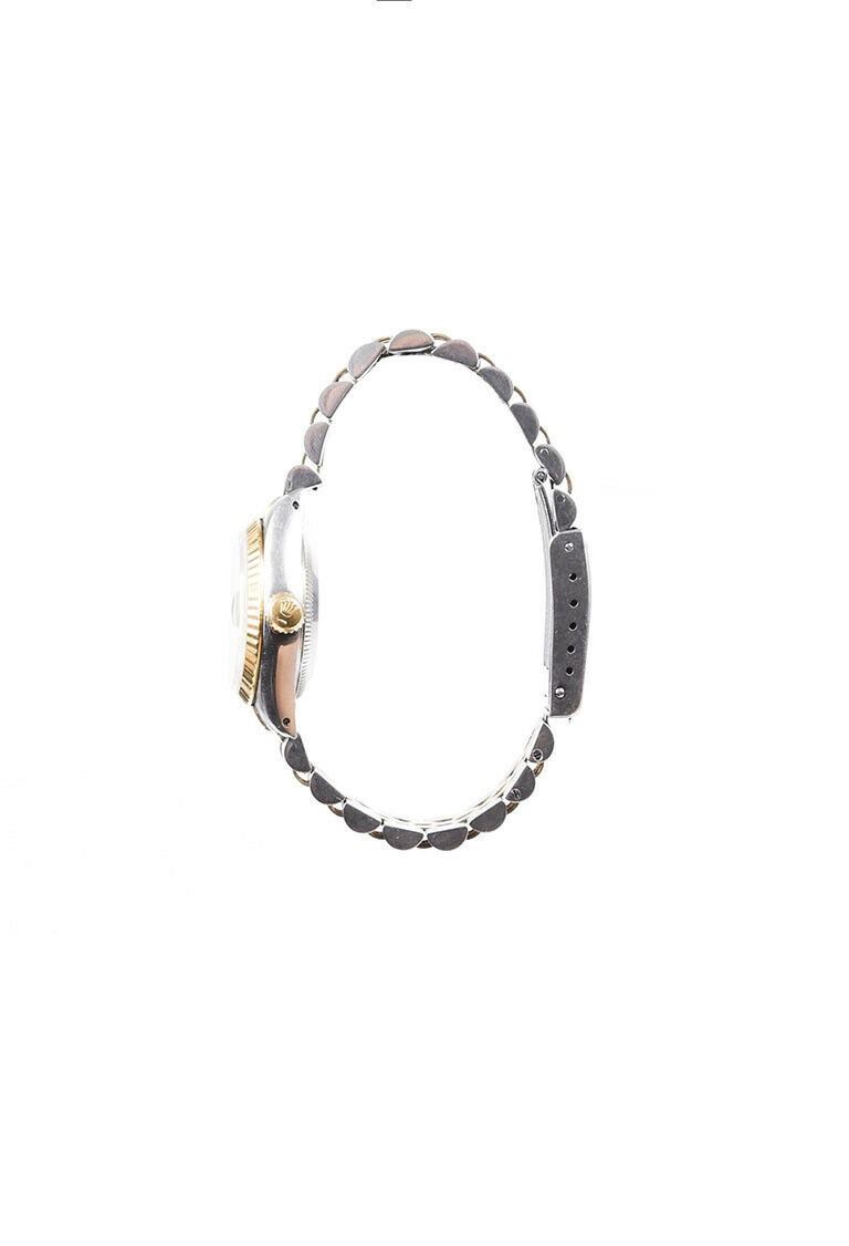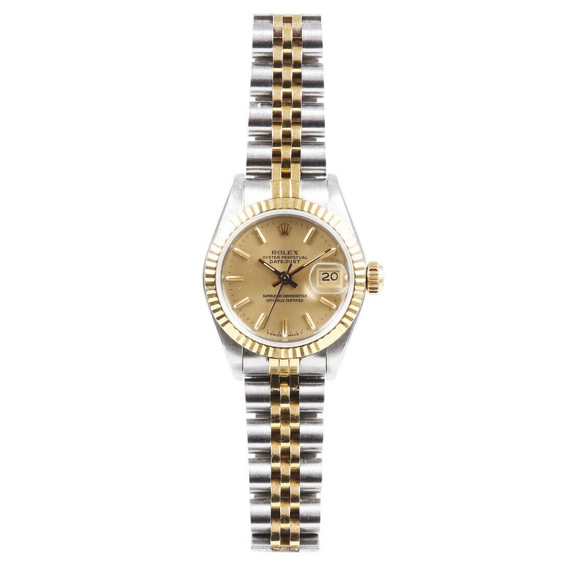 Circa 1987. Vintage Rolex Lady Datejust 18k yellow gold and stainless steel watch features automatic movement, date window with a Cyclops lens, and a three piece link bracelet strap with a crown clasp.