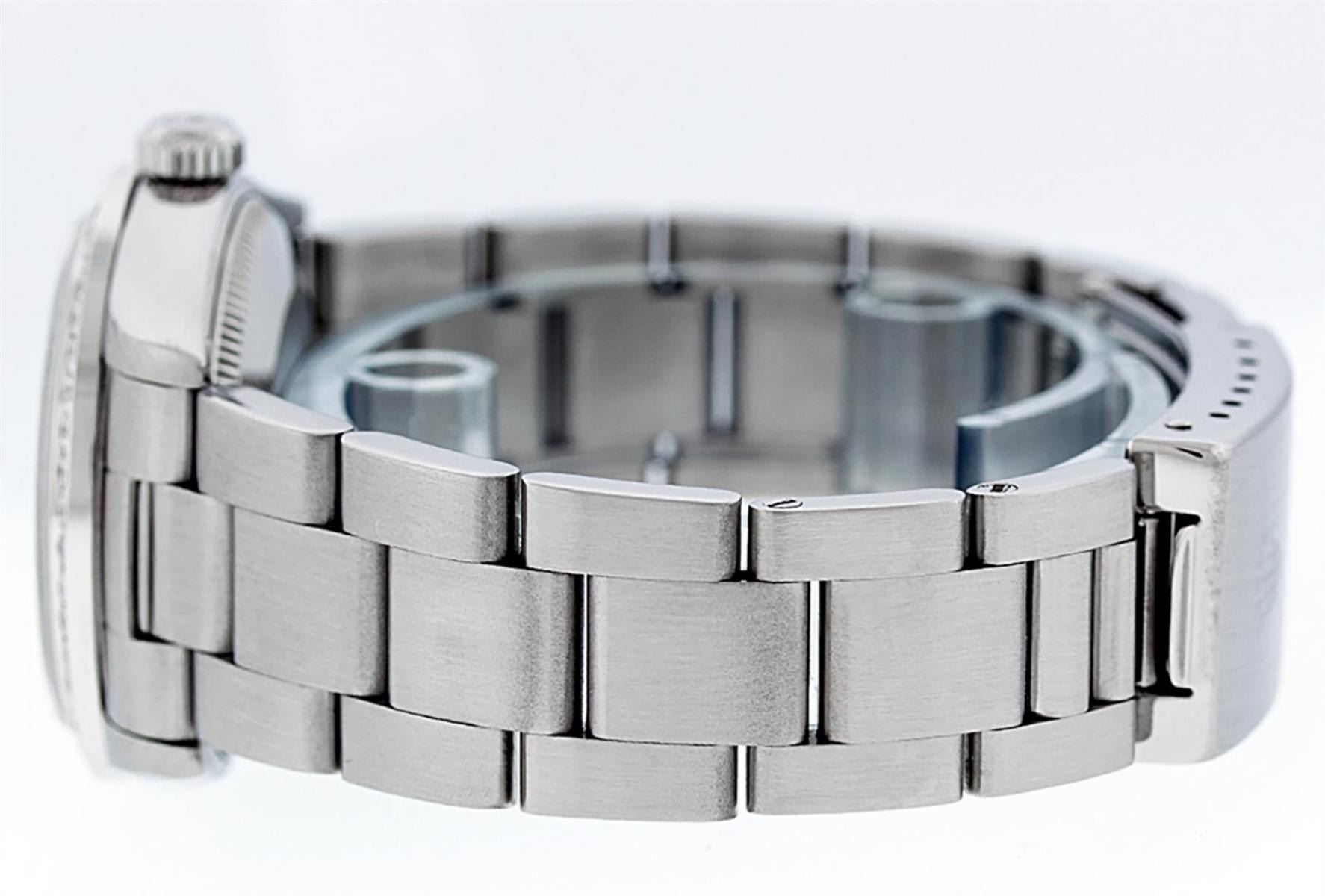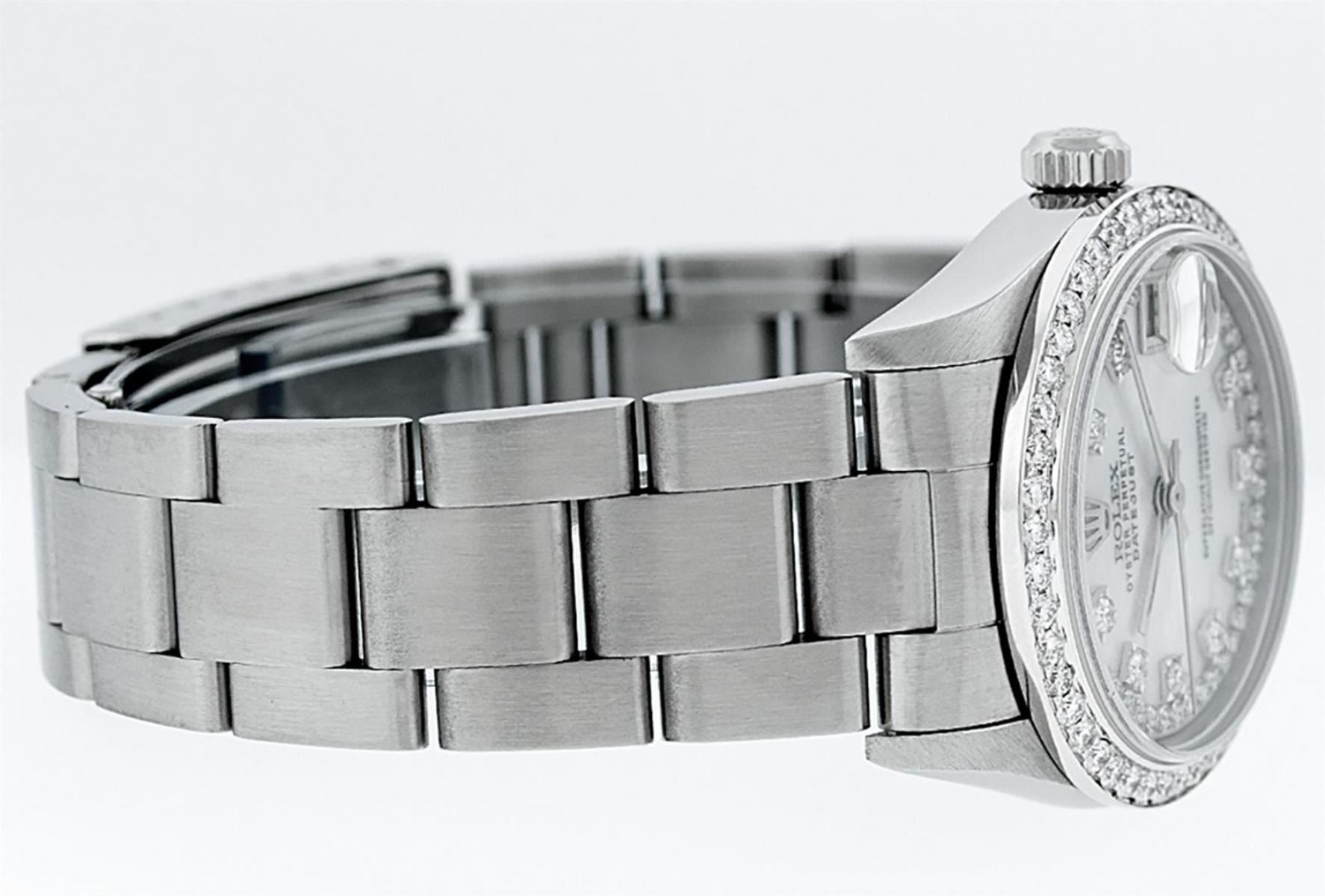 One Womens Midsize Stainless Steel Rolex Datejust Polished, Serviced & Electronically Tested, Stainless Steel Case Case: 31mm, Stainless Steel Crown, Custom Bezel: New 18K White Gold Beadset Diamond Bezel, Diamond Count: 44 Diamonds On Bezel, Color: G To H, Clarity: VS2-SI1. Custom Crystal: New Scratch Resistant Synthetic Sapphire Cyclops Lens. Custom Hands: New Luminecent Hands. Movement: Automatic Winding Movement Caliber 2235. Custom Dial: Mother Of Pearl String Diamond Dial. Diamond Count: 43 Single Cut Diamonds On Dial; Color: G to H, Clarity: VS2-SI1, Date Window: 3 O'Clock Position Date Display, Quickset, Model: Midsize Datejust. Condition: G-6 Extra Fine. Bracelet: Stainless Steel Oyster Band. Bright Polish. 6.0 Inch Length, Adjustable. Standard Clasp, With Rolex Logo. This Watch Has Been Serviced Time Tested And Is In Excellent Condition It Is Free Of All Scratches And Dents.