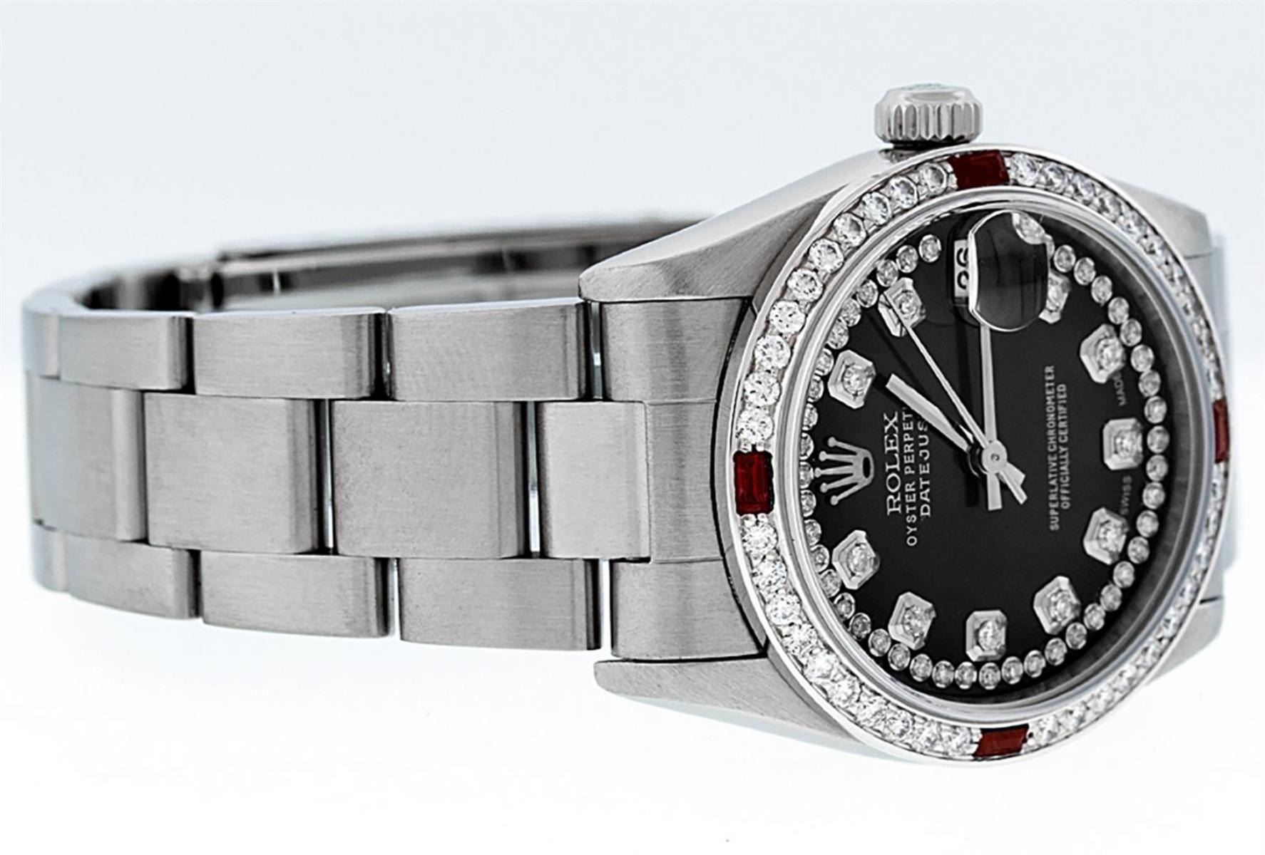 One Womens Midsize Stainless Steel Rolex Datejust Polished, Serviced & Electronically Tested, Stainless Steel Case Case: 31mm, Stainless Steel Crown, Custom Bezel: New 18K White Gold Ruby Beadset Diamond Bezel, Diamond Count: 40 Diamonds + 4 Ruby On Bezel, Color: G To H, Clarity: VS2-SI1. Custom Crystal: New Scratch Resistant Synthetic Sapphire Cyclops Lens. Custom Hands: New Luminecent Hands. Movement: Automatic Winding Movement Caliber 2235. Custom Dial: Black String Diamond Dial. Diamond Count: 43 Diamonds On Dial; Color: G to H, Clarity: VS2-SI1, Date Window: 3 O'Clock Position Date Display, Quickset, Model: Midsize Datejust. Condition: G-6 Extra Fine. Bracelet: Stainless Steel Oyster Band. Bright Polish. 6.0 Inch Length, Adjustable. Standard Clasp, With Rolex Logo. This Watch Has Been Serviced Time Tested And Is In Excellent Condition It Is Free Of All Scratches And Dents. This Is The Larger Version Of The Ladies Watch.