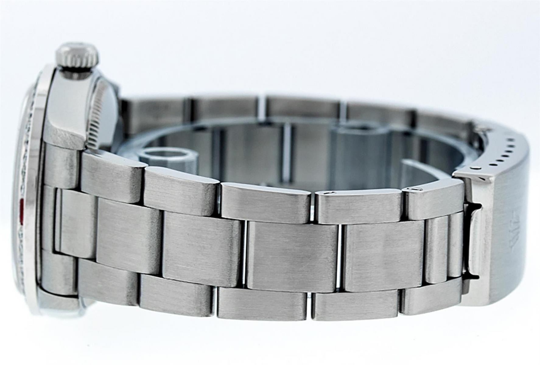 One Womens Midsize Stainless Steel Rolex Datejust Polished, Serviced & Electronically Tested, Stainless Steel Case Case: 31mm, Stainless Steel Crown, Custom Bezel: New 18K White Gold Ruby Beadset Diamond Bezel, Diamond Count: 40 Diamonds + 4 Ruby On Bezel, Color: G To H, Clarity: VS2-SI1. Custom Crystal: New Scratch Resistant Synthetic Sapphire Cyclops Lens. Custom Hands: New Luminecent Hands. Movement: Automatic Winding Movement Caliber 2235. Custom Dial: Black String Diamond Dial. Diamond Count: 43 Diamonds On Dial; Color: G to H, Clarity: VS2-SI1, Date Window: 3 O'Clock Position Date Display, Quickset, Model: Midsize Datejust. Condition: G-6 Extra Fine. Bracelet: Stainless Steel Oyster Band. Bright Polish. 6.0 Inch Length, Adjustable. Standard Clasp, With Rolex Logo. This Watch Has Been Serviced Time Tested And Is In Excellent Condition It Is Free Of All Scratches And Dents. This Is The Larger Version Of The Ladies Watch.