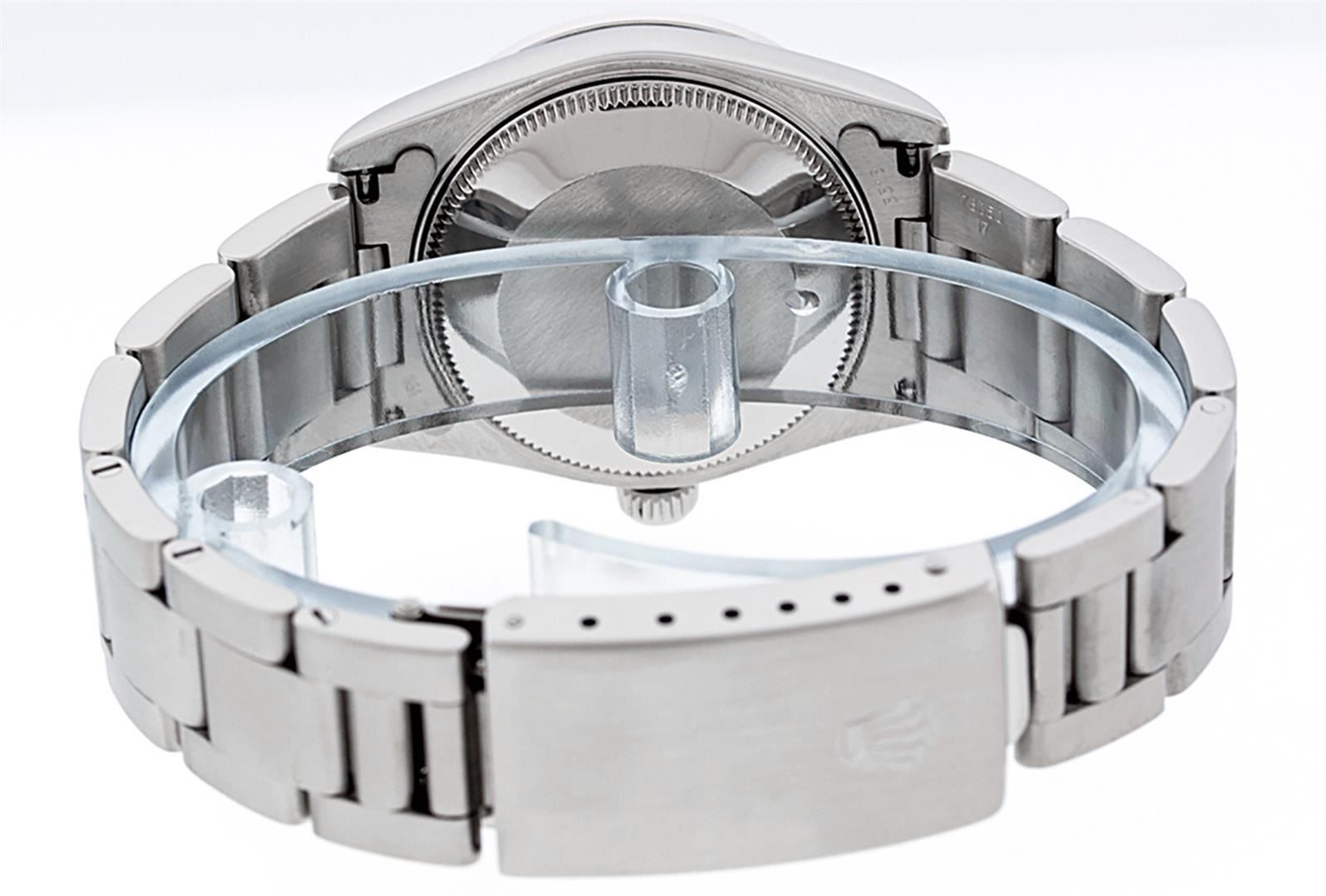 One Women's Pre Owned Midsize Stainless Steel Rolex Datejust Polished, Serviced & Electronically Tested, Stainless Steel Case Case: 31mm, Stainless Steel Crown, Custom Bezel: New 18K White Gold Ruby Beadset Diamond Bezel, Diamond Count: 40 Diamonds + 4 Rubies On Bezel. Custom Crystal: New Sapphire With Magnified Date Window. Custom Hands: New Luminescent Hands. Rolex Movement: Automatic Winding Movement Caliber 2235. Custom Dial: Black With Custom Added String Diamond Hour Markers. Diamond Count: 43 Single Diamonds On Dial. Date Window: 3 O'Clock Position Date Display, Quickset, Model: Midsize Datejust. Condition: G-6 Extra Fine. Rolex Bracelet: Stainless Steel Oyster Band. Bright Polish. 6.0 Inch Length, Adjustable. Standard Clasp, With Rolex Logo. This Watch Has Been Serviced Time Tested And Is In Excellent Condition It Is Free Of All Scratches And Dents.