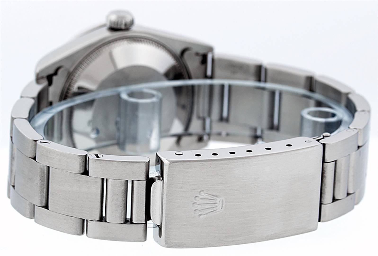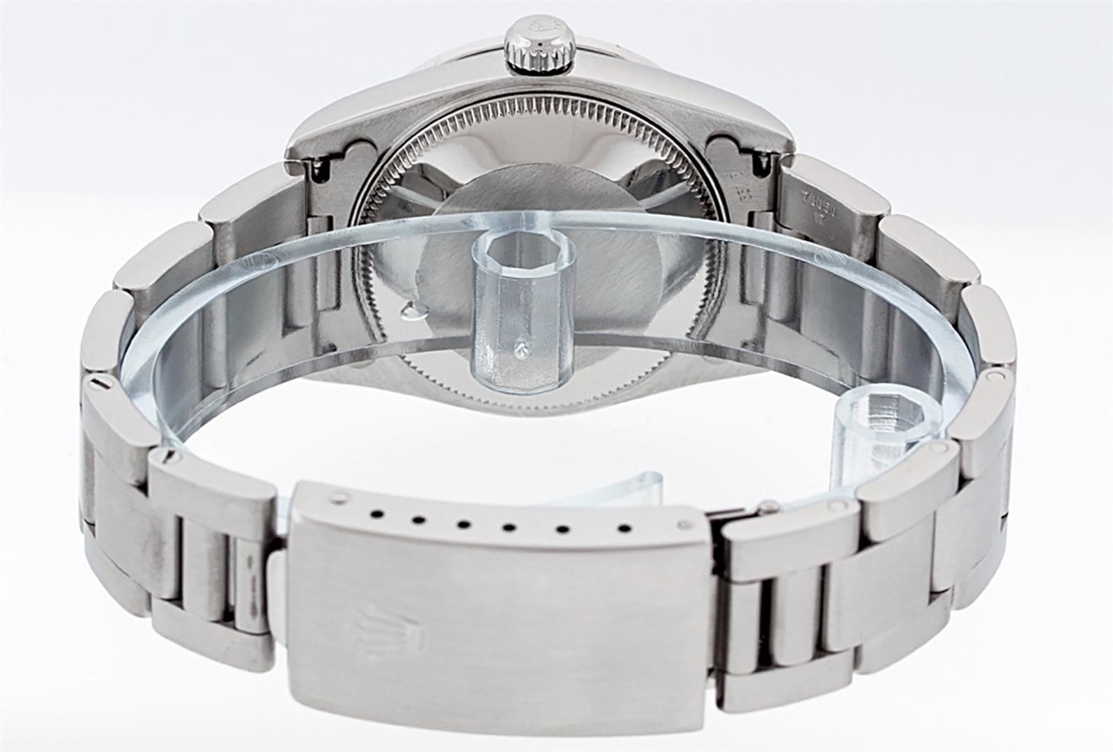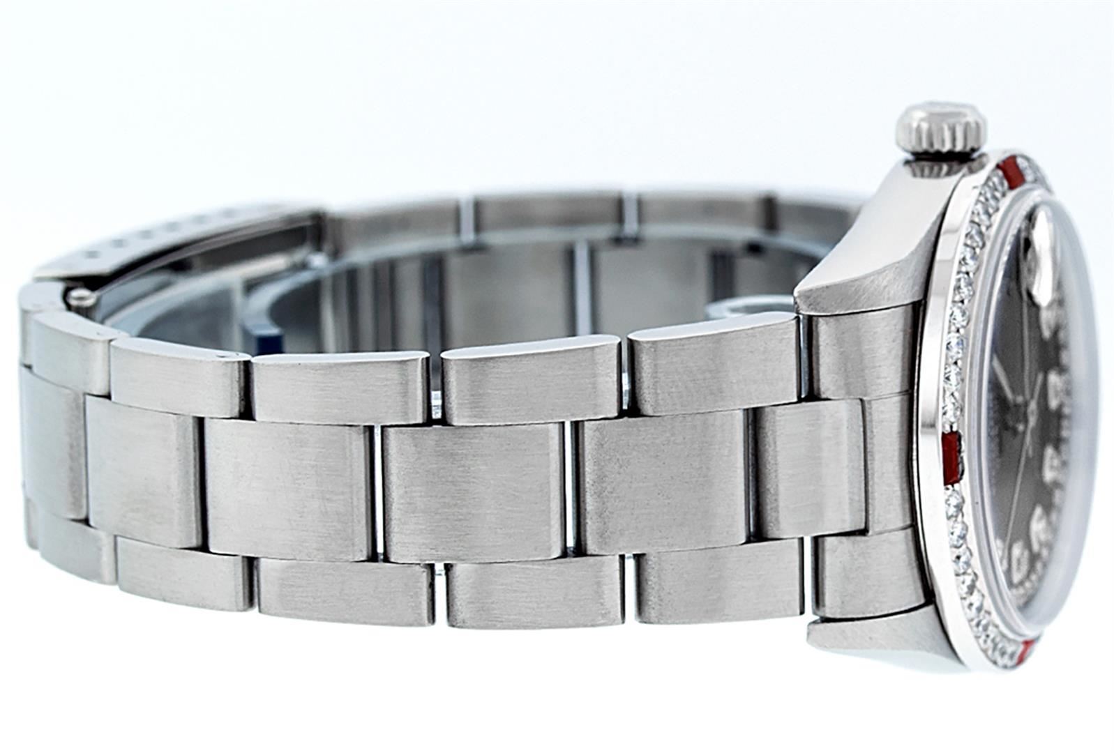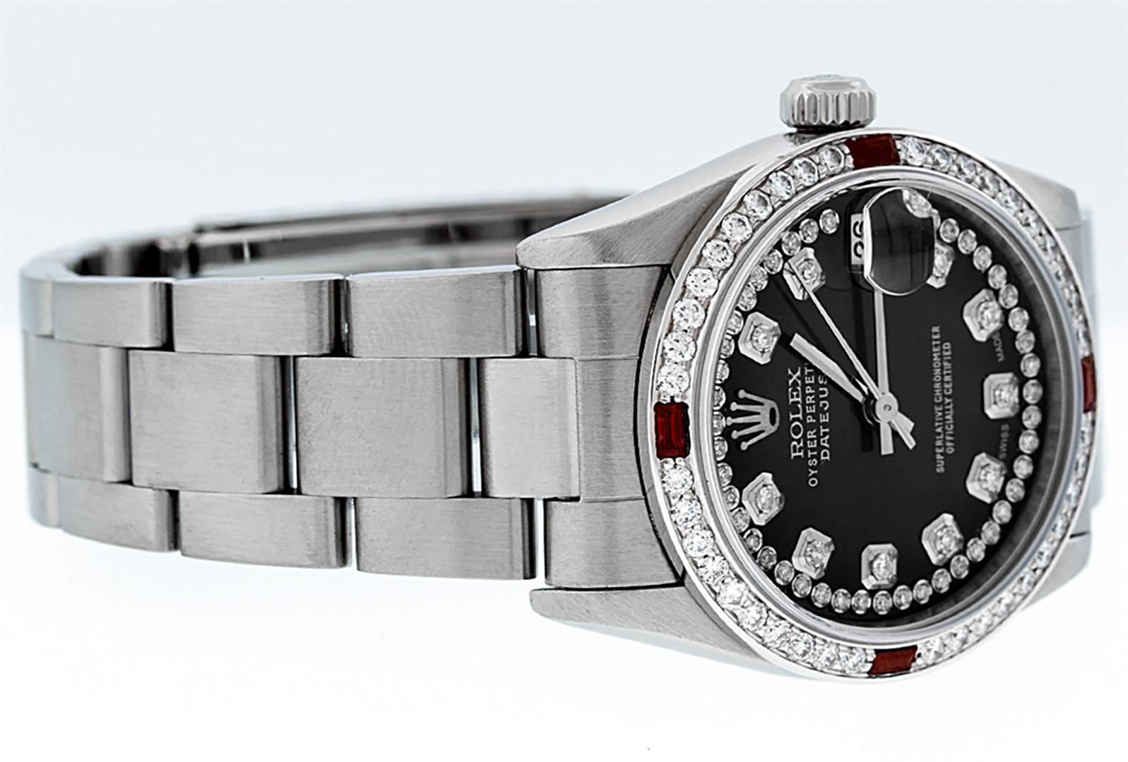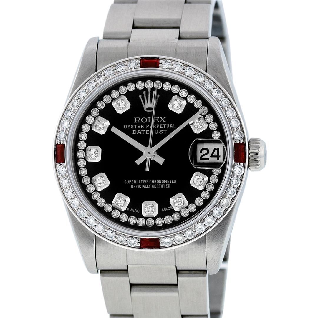 One Women's Pre Owned Midsize Stainless Steel Rolex Datejust Polished, Serviced & Electronically Tested, Stainless Steel Case Case: 31mm, Stainless Steel Crown, Custom Bezel: New 18K White Gold Ruby Beadset Diamond Bezel, Diamond Count: 40 Diamonds + 4 Rubies On Bezel. Custom Crystal: New Sapphire With Magnified Date Window. Custom Hands: New Luminescent Hands. Rolex Movement: Automatic Winding Movement Caliber 2235. Custom Dial: Black With Custom Added String Diamond Hour Markers. Diamond Count: 43 Single Diamonds On Dial. Date Window: 3 O'Clock Position Date Display, Quickset, Model: Midsize Datejust. Condition: G-6 Extra Fine. Rolex Bracelet: Stainless Steel Oyster Band. Bright Polish. 6.0 Inch Length, Adjustable. Standard Clasp, With Rolex Logo. This Watch Has Been Serviced Time Tested And Is In Excellent Condition It Is Free Of All Scratches And Dents.