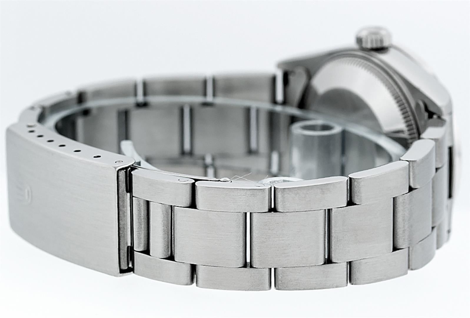 One Women's Pre Owned Midsize Stainless Steel Rolex Datejust Polished, Serviced & Electronically Tested, Stainless Steel Case Case: 31mm, Stainless Steel Crown, Custom Bezel: New 18K White Gold Sapphire Beadset Diamond Bezel, Diamond Count: 40 Diamonds + 4 Sapphires On Bezel. Custom Crystal: New Sapphire With Magnified Date Window. Custom Hands: New Luminecent Hands. Rolex Movement: Automatic Winding Movement Caliber 2235. Custom Dial: Blue With Custom Added Diamond Hour Markers Diamond Count: 43 Single Cut Diamonds On Dial. Date Window: 3 O'Clock Position Date Display, Quickset, Model: Midsize Datejust. Condition: G-6 Extra Fine. Rolex Bracelet: Stainless Steel Oyster Band. Bright Polish. 6.0 Inch Length, Adjustable. Standard Clasp, With Rolex Logo. This Watch Has Been Serviced Time Tested And Is In Excellent Condition It Is Free Of All Scratches And Dents.