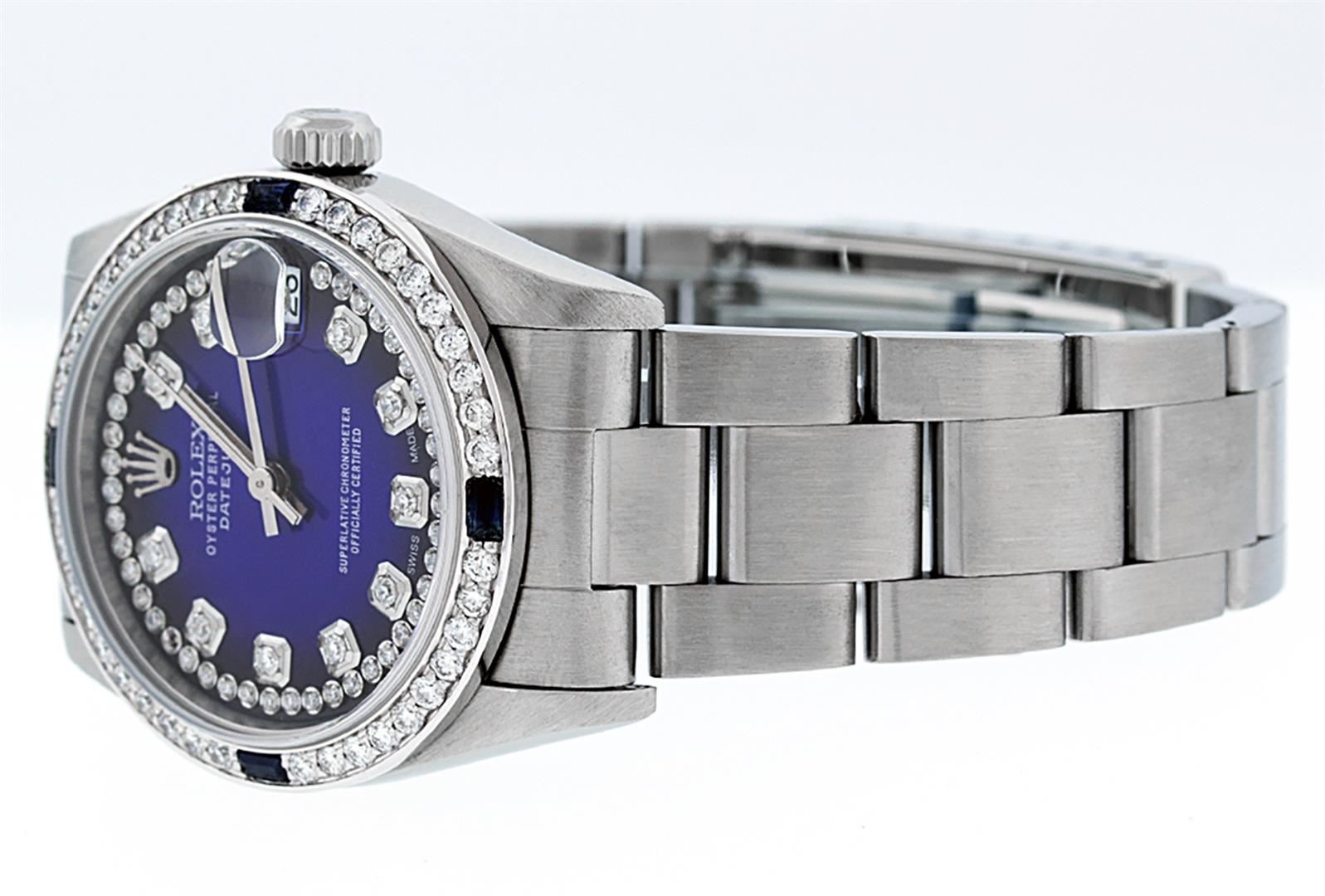 One Womens Midsize Stainless Steel Rolex Datejust Polished, Serviced & Electronically Tested, Stainless Steel Case Case: 31mm, Stainless Steel Crown, Custom Bezel: New 18K White Gold Sapphire Beadset Diamond Bezel, Diamond Count: 40 Diamonds + 4 Sapphires On Bezel, Color: G To H, Clarity: VS2-SI1. Custom Crystal: New Scratch Resistant Synthetic Sapphire Cyclops Lens. Custom Hands: New Luminecent Hands. Movement: Automatic Winding Movement Caliber 2235. Custom Dial: Blue Vignette String Diamond Dial. Diamond Count: 43 Single Diamonds On Dial; Color: G to H, Clarity: VS2-SI1, Date Window: 3 O'Clock Position Date Display, Quickset, Model: Midsize Datejust. Condition: G-6 Extra Fine. Bracelet: Stainless Steel Oyster Band. Bright Polish. 6.0 Inch Length, Adjustable. Standard Clasp, With Rolex Logo. This Watch Has Been Serviced Time Tested And Is In Excellent Condition It Is Free Of All Scratches And Dents. This Is The Larger Version Of The Ladies Watch.