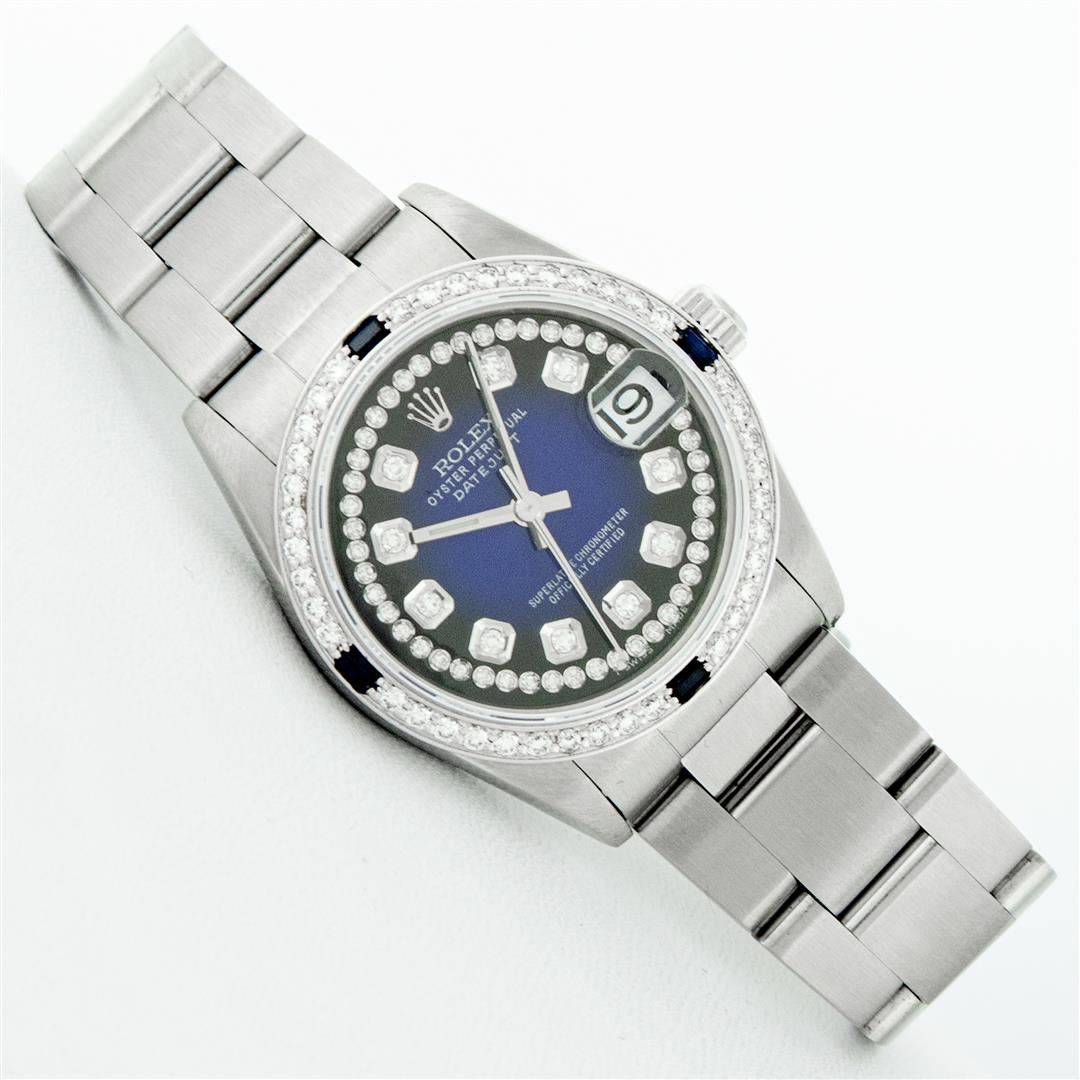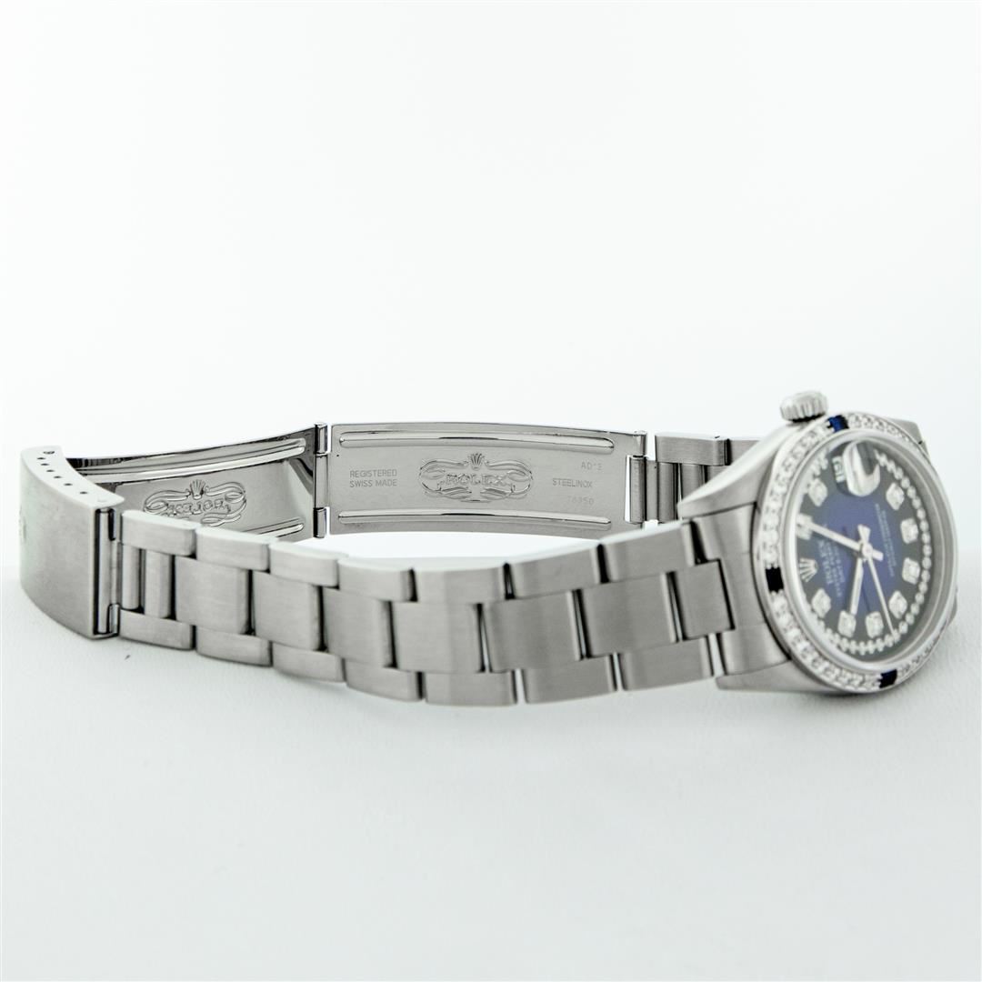 One Women's Pre Owned Midsize Stainless Steel Rolex Datejust Polished, Serviced & Electronically Tested, Stainless Steel Case Case: 31mm, Stainless Steel Crown, Custom Bezel: New 18K White Gold Sapphire Beadset Diamond Bezel, Diamond Count: 40 Diamonds + 4 Sapphires On Bezel. Custom Crystal: New Sapphire With Magnified Date Window. Custom Hands: New Luminescent Hands. Rolex Movement: Automatic Winding Movement Caliber 2235. Custom Dial: Blue Vignette With Custom Added String Diamond Hour Markers. Diamond Count: 43 Single Diamonds On Dial. Date Window: 3 O'Clock Position Date Display, Quickset, Model: Midsize Datejust. Condition: G-6 Extra Fine. Rolex Bracelet: Stainless Steel Oyster Band. Bright Polish. 6.0 Inch Length, Adjustable. Standard Clasp, With Rolex Logo. This Watch Has Been Serviced Time Tested And Is In Excellent Condition It Is Free Of All Scratches And Dents.