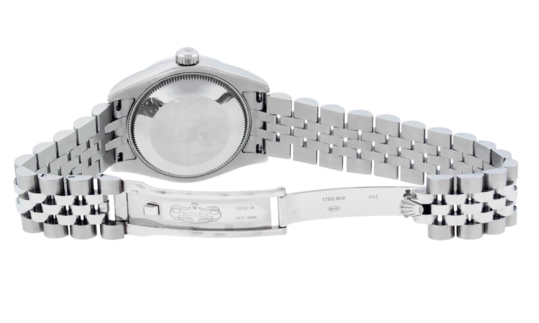 One Womens Pre Owned Midsize Stainless Steel Rolex Datejust Polished, Serviced & Electronically Tested, Stainless Steel Case Case: 31mm, Custom Diamond Lugs: Stone Count 20 Diamonds On Lugs. Stainless Steel Crown, Custom Bezel: New 18K White Beadset Diamond Bezel, Diamond Count: 45 Diamonds On Bezel. Custom Crystal: New Sapphire With Date Window. Custom Hands: New Hands. Rolex Movement: Automatic Winding Movement Caliber 2235. Custom Dial: Green With Custom Added String Diamonds. Diamond Count: 10 Single Cut Diamonds. Date Window: 3 O'Clock Position Date Display, Quickset, Model: Midsize Datejust. Condition: G-6 Extra Fine. Rolex Bracelet: Stainless Steel Jubilee Band With Hidden Clasp. Bright Polish. 6.0 Inch Length, Adjustable. Hidden Clasp, With Rolex Logo. This Watch Has Been Serviced Time Tested And Is In Excellent Condition It Is Free Of All Scratches And Dents.