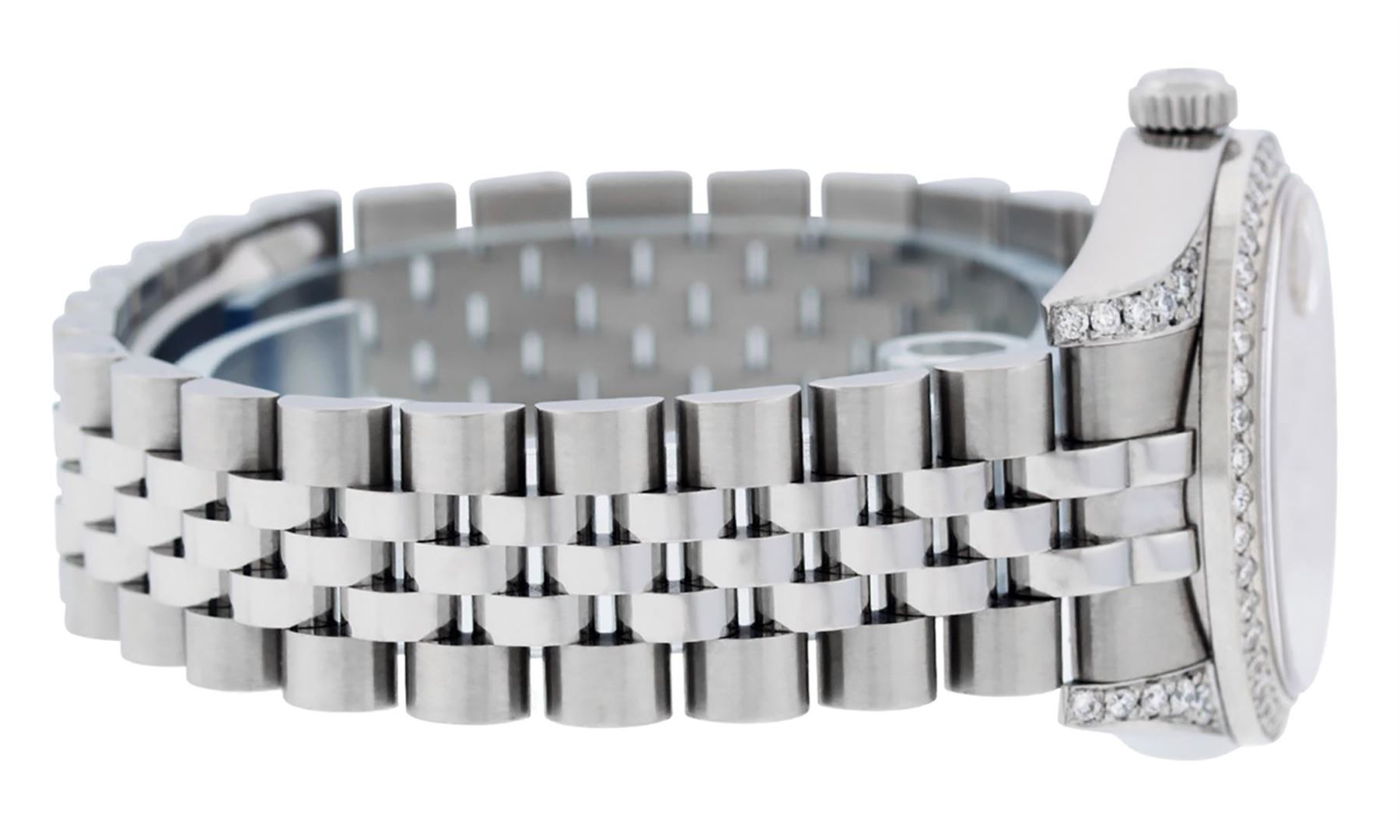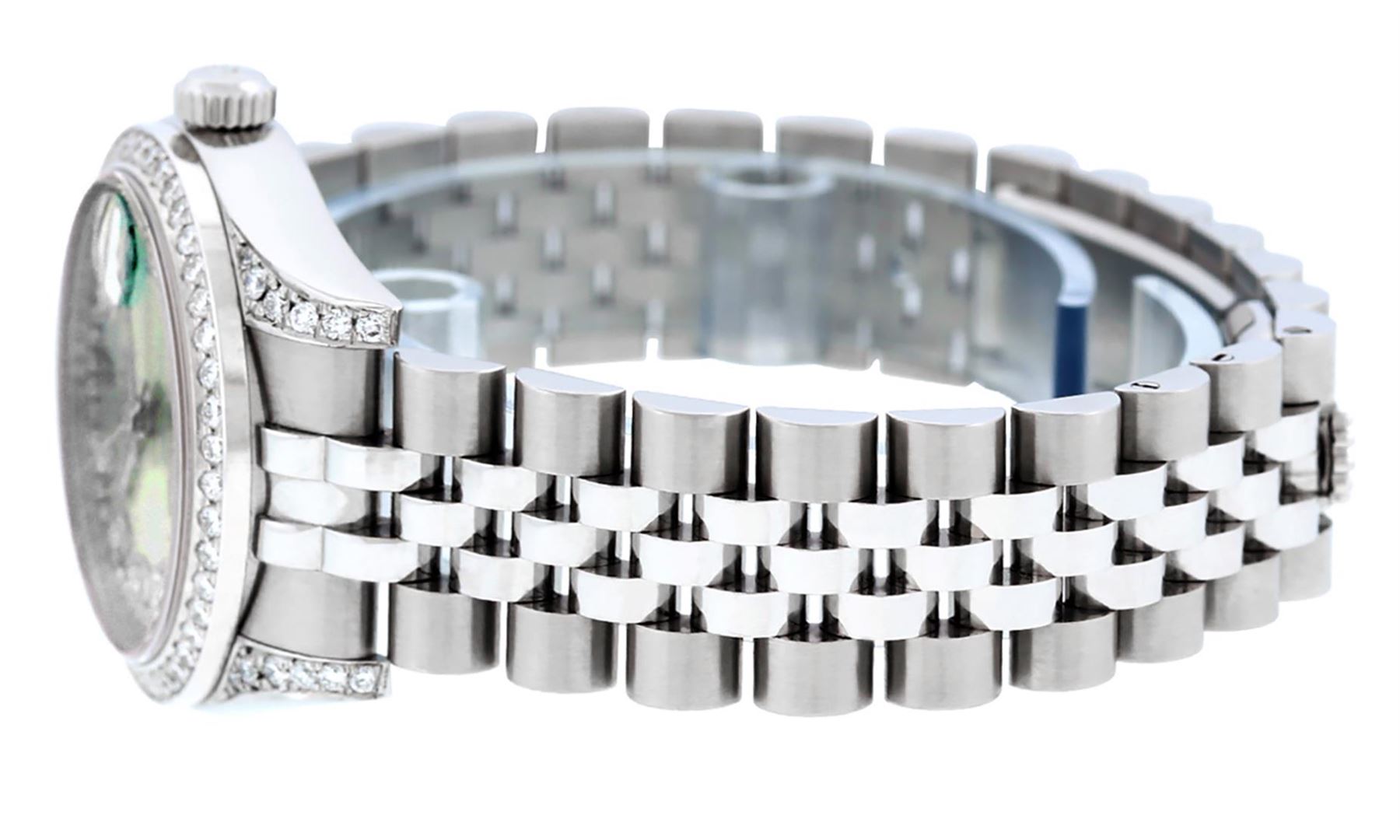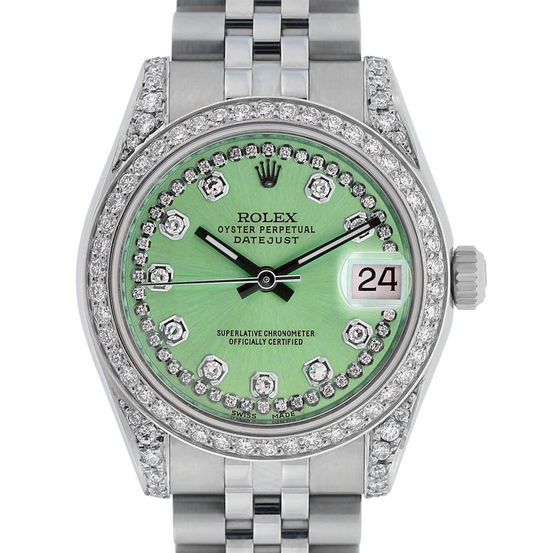 One Womens Pre Owned Midsize Stainless Steel Rolex Datejust Polished, Serviced & Electronically Tested, Stainless Steel Case Case: 31mm, Custom Diamond Lugs: Stone Count 20 Diamonds On Lugs. Stainless Steel Crown, Custom Bezel: New 18K White Beadset Diamond Bezel, Diamond Count: 45 Diamonds On Bezel. Custom Crystal: New Sapphire With Date Window. Custom Hands: New Hands. Rolex Movement: Automatic Winding Movement Caliber 2235. Custom Dial: Green With Custom Added String Diamonds. Diamond Count: 10 Single Cut Diamonds. Date Window: 3 O'Clock Position Date Display, Quickset, Model: Midsize Datejust. Condition: G-6 Extra Fine. Rolex Bracelet: Stainless Steel Jubilee Band With Hidden Clasp. Bright Polish. 6.0 Inch Length, Adjustable. Hidden Clasp, With Rolex Logo. This Watch Has Been Serviced Time Tested And Is In Excellent Condition It Is Free Of All Scratches And Dents.