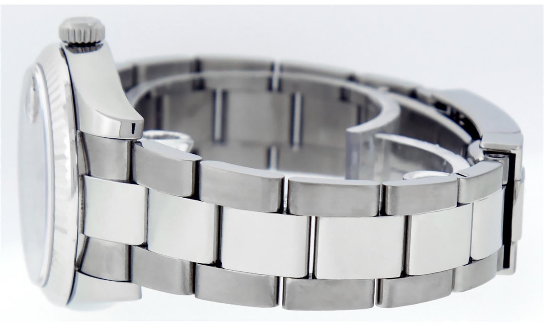One Women's Pre Owned Midsize Stainless Steel Rolex Datejust Polished, Serviced & Electronically Tested, Rolex Stainless Steel Case Case: 31mm, Rolex Stainless Steel Crown, Rolex Bezel: Rolex White Gold Fluted Bezel. Rolex Crystal: Sapphire Cyclops Lens. Rolex Hands: Luminescent Hands. Rolex Movement: Automatic Winding Movement Caliber 2235. Custom Dial: Refinished To Pink With Custom Added Genuine Diamonds. Diamond Count: 43 Single Cut Diamonds On Dial; Color: G to H, Clarity: VS2-SI1, Date Window: 3 O'Clock Position Date Display, Quickset, Model: Midsize Datejust. Condition: G-6 Extra Fine. Rolex Bracelet: Stainless Steel Oyster Band. Bright Polish. 6.0 Inch Length, Adjustable. Standard Clasp, With Rolex Logo. This Watch Has Been Serviced Time Tested And Is In Excellent Condition It Is Free Of All Scratches And Dents.