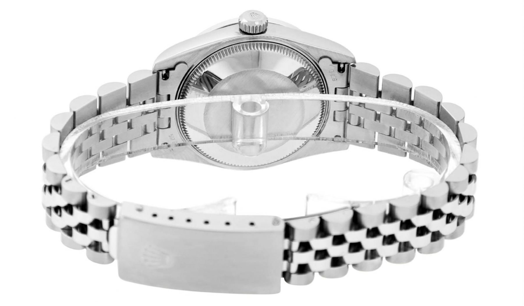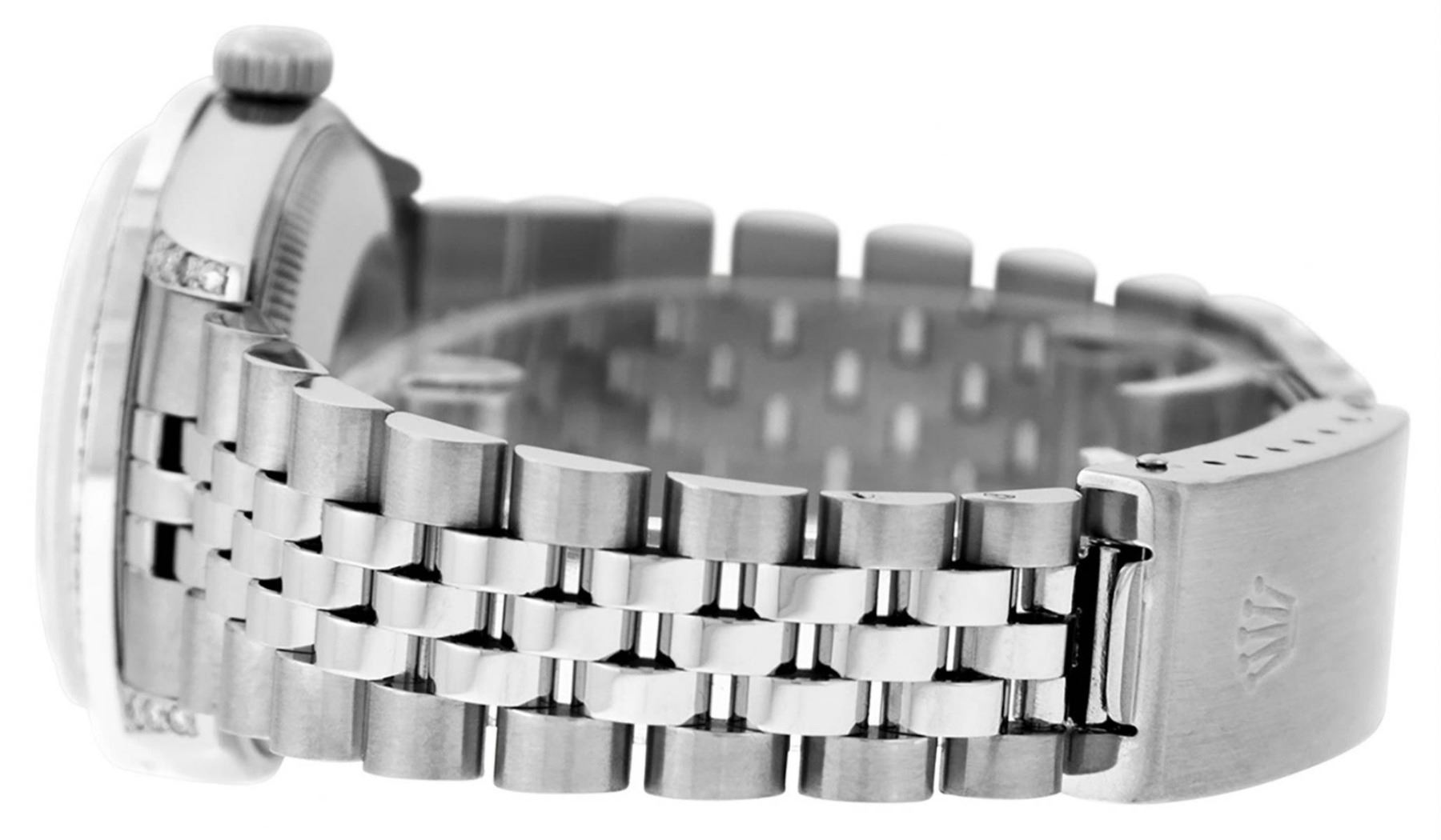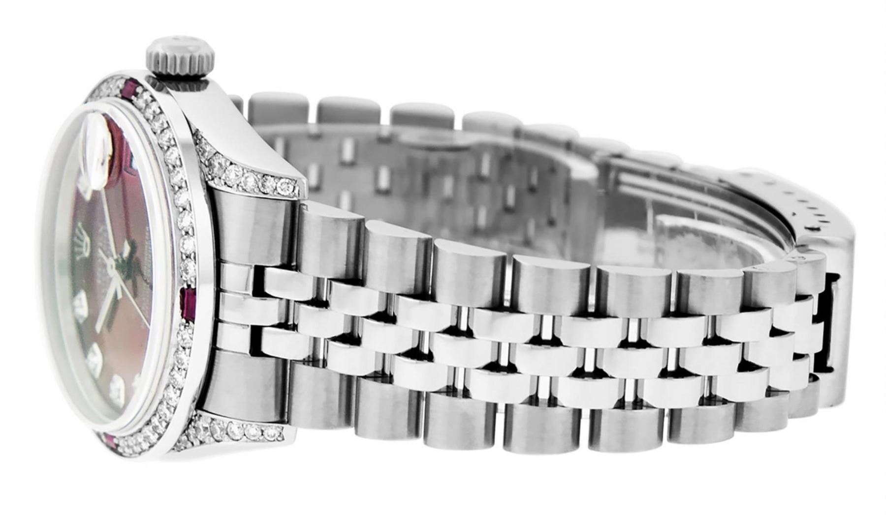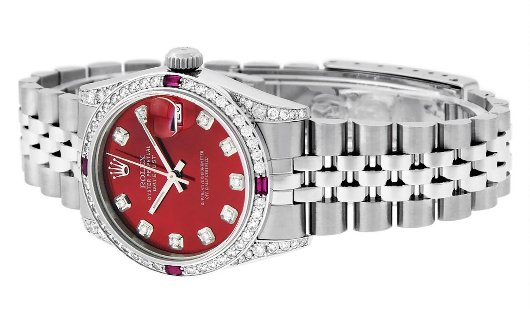 One Womens Midsize Stainless Steel Rolex Datejust Polished, Serviced & Electronically Tested, Stainless Steel Case Case: 31mm, Stainless Steel Crown, Custom Diamond Lugs: 24 Diamonds On Lugs; Color: G To H, Clarity: SI-VS. Custom Bezel: New 18K White Gold Ruby Beadset Diamond Bezel, Diamond Count: 40 Diamonds + 4 Rubies, Color: G To H, Clarity: VS2-SI1. Custom Crystal: New Scratch Resistant Synthetic Sapphire Cyclops Lens. Custom Hands: New Luminecent Hands. Movement: Automatic Winding Movement Caliber 2135. Custom Dial: Red Diamond Dial. Diamond Count: 10 Single Cut Diamonds On Dial; Color: G to H, Clarity: VS2-SI1, Date Window: 3 O'Clock Position Date Display, Quickset, Model: Midsize Datejust. Condition: G-6 Extra Fine. Bracelet: Stainless Steel Jubilee Band. Bright Polish. 6.0 Inch Length, Adjustable. Standard Clasp, With Rolex Logo. This Watch Has Been Serviced Time Tested And Is In Excellent Condition It Is Free Of All Scratches And Dents.
