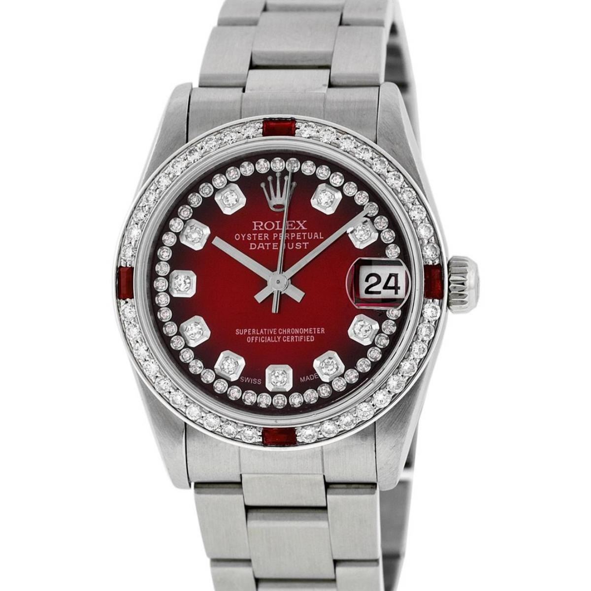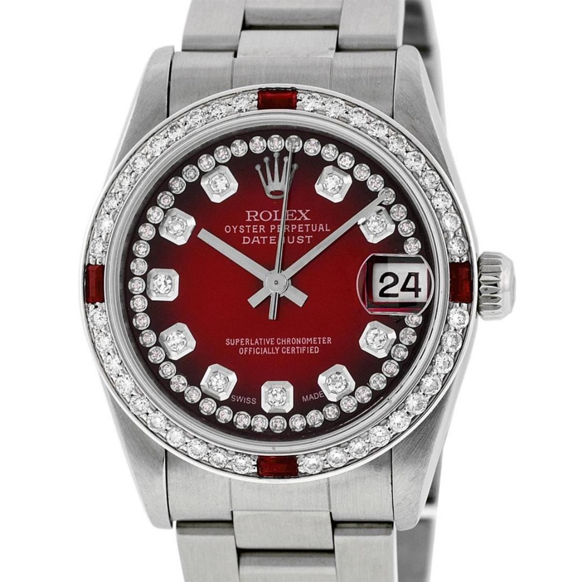 One Womens Midsize Stainless Steel Rolex Datejust Polished, Serviced & Electronically Tested, Stainless Steel Case Case: 31mm, Stainless Steel Crown, Custom Bezel: New 18K White Gold Ruby Beadset Diamond Bezel, Diamond Count: 40 Diamonds + 4 Rubies On Bezel, Color: G To H, Clarity: VS2-SI1. Custom Crystal: New Scratch Resistant Synthetic Sapphire Cyclops Lens. Custom Hands: New Luminecent Hands. Movement: Automatic Winding Movement Caliber 2235. Custom Dial: Red Vignette String Diamond Dial. Diamond Count: 43 Single Cut Diamonds On Dial; Color: G to H, Clarity: VS2-SI1, Date Window: 3 O'Clock Position Date Display, Quickset, Model: Midsize Datejust. Condition: G-6 Extra Fine. Bracelet: Stainless Steel Oyster Band. Bright Polish. 6.0 Inch Length, Adjustable. Standard Clasp, With Rolex Logo. This Watch Has Been Serviced Time Tested And Is In Excellent Condition It Is Free Of All Scratches And Dents.