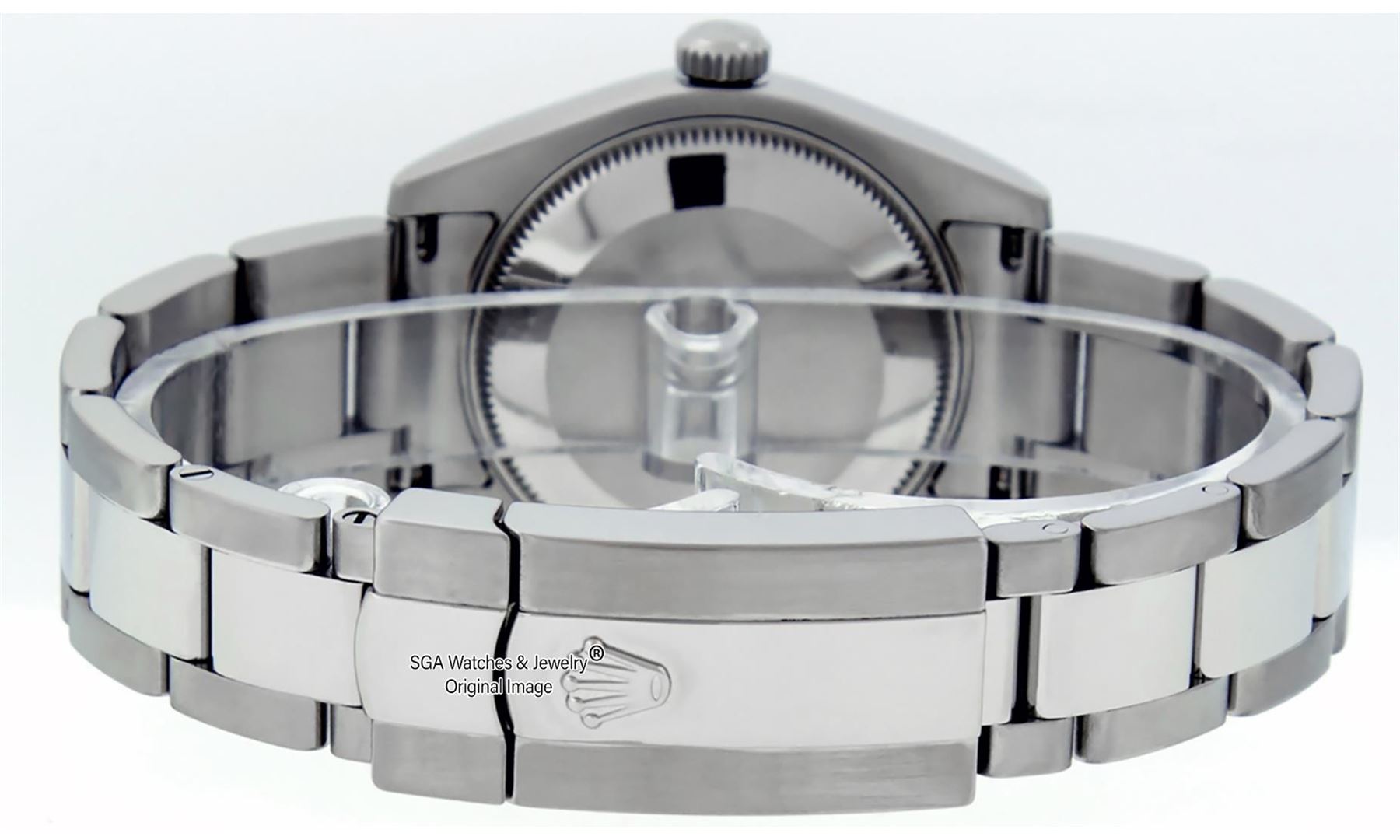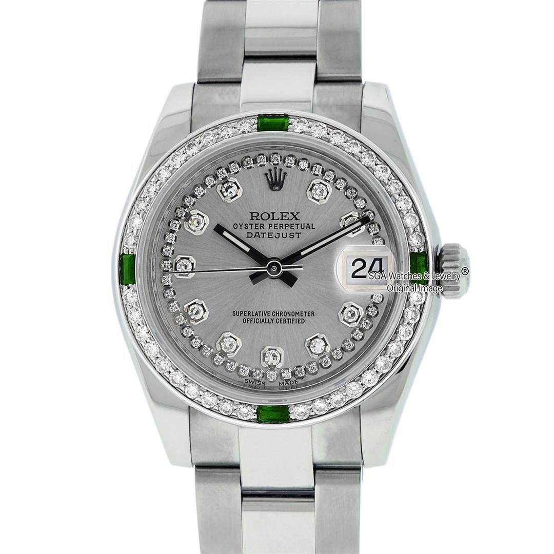 One Women's Pre Owned Midsize Stainless Steel Rolex Datejust Polished, Serviced & Electronically Tested, Stainless Steel Case Case: 31mm, Stainless Steel Crown, Custom Bezel: New 18K White Gold Emerald Beadset Diamond Bezel, Diamond Count: 40 Diamonds + 4 Emeralds On Bezel. Custom Crystal: New Sapphire With Date Window. Custom Hands: New Luminescent Hands. Rolex Movement: Automatic Winding Movement Caliber 2235. Custom Dial: Gray With Custom Added String Diamonds. Diamond Count: 43 Diamonds On Dial. Date Window: 3 O'Clock Position Date Display, Quickset, Model: Midsize Datejust. Condition: G-6 Extra Fine. Rolex Bracelet: Stainless Steel Oyster Band. Bright Polish. 6.0 Inch Length, Adjustable. Standard Clasp, With Rolex Logo. This Watch Has Been Serviced Time Tested And Is In Excellent Condition It Is Free Of All Scratches And Dents.