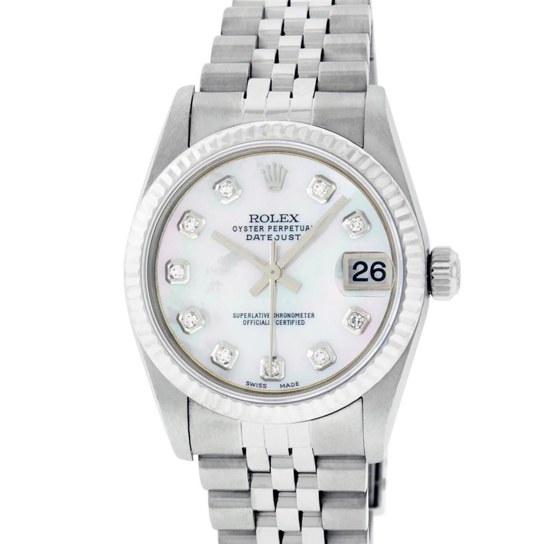 One Womens Midsize Stainless Steel Rolex Datejust Polished, Serviced & Electronically Tested, Stainless Steel Case Case: 31mm, Stainless Steel Crown, Bezel: White Gold Fluted Bezel, Custom Crystal: New Scratch Resistant Synthetic Sapphire Cyclops Lens. Custom Hands: New Hands. Movement: Automatic Winding Movement Caliber 2135. Custom Dial: Refinished MOP Diamond Dial, Diamond Count: 10 Single Cut Diamonds On Dial, Date Window: 3 O'Clock Position Date Display, Quickset, Model: Midsize Datejust. Condition: G-6 Extra Fine. Bracelet: Stainless Steel Jubilee Band. Bright Polish. 6.0 Inch Length, Adjustable. Standard Clasp, With Rolex Logo. This Watch Has Been Serviced Time Tested And Is In Excellent Condition It Is Free Of All Scratches And Dents.