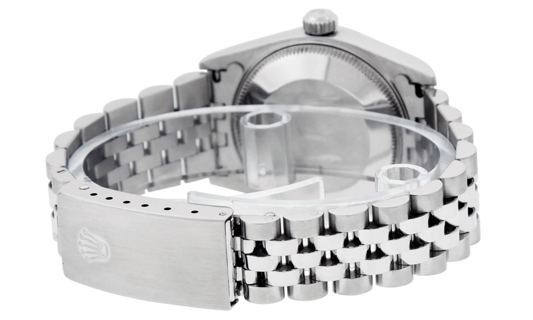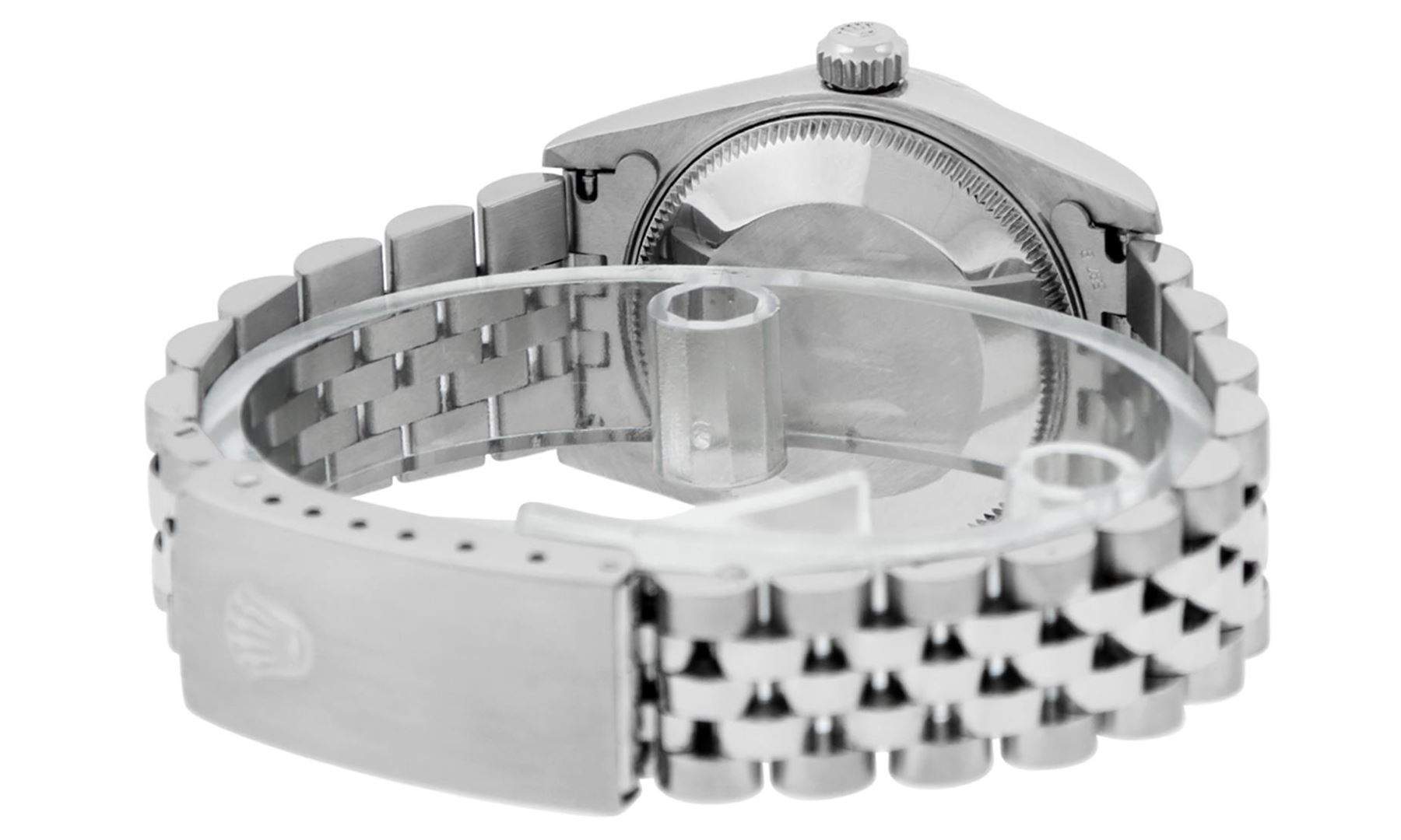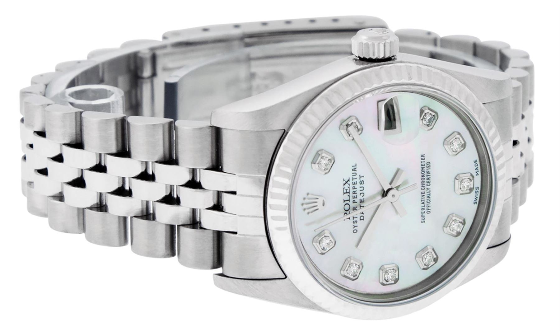 One Womens Midsize Stainless Steel Rolex Datejust Polished, Serviced & Electronically Tested, Stainless Steel Case Case: 31mm, Stainless Steel Crown, Bezel: White Gold Fluted Bezel, Custom Crystal: New Scratch Resistant Synthetic Sapphire Cyclops Lens. Custom Hands: New Hands. Movement: Automatic Winding Movement Caliber 2135. Custom Dial: Refinished MOP Diamond Dial, Diamond Count: 10 Single Cut Diamonds On Dial, Date Window: 3 O'Clock Position Date Display, Quickset, Model: Midsize Datejust. Condition: G-6 Extra Fine. Bracelet: Stainless Steel Jubilee Band. Bright Polish. 6.0 Inch Length, Adjustable. Standard Clasp, With Rolex Logo. This Watch Has Been Serviced Time Tested And Is In Excellent Condition It Is Free Of All Scratches And Dents.