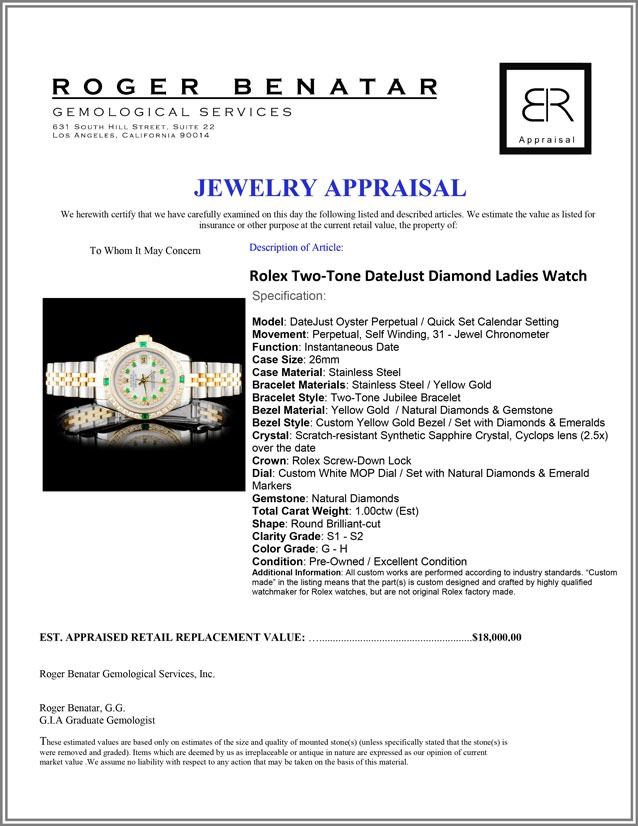 Dial: Custom White MOP Dial / Set with Natural Diamonds & Emerald Markers