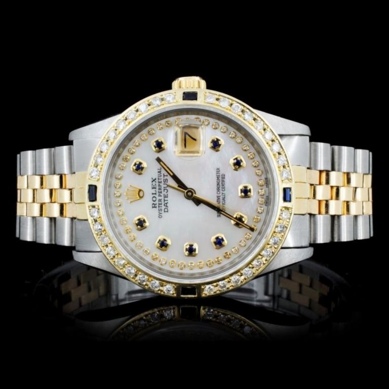 Bezel Style: Custom Yellow Gold Bezel with diamonds and Sapphire