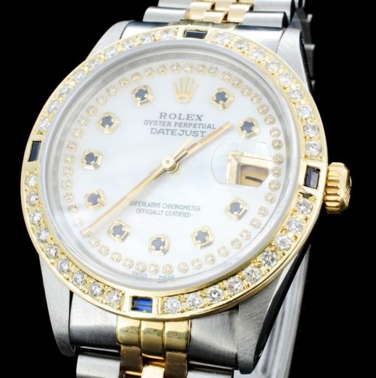 Dial: Custom White Mother of Pearl Dial with diamond and Sapphire markers