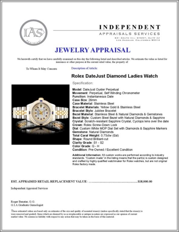 Regarding Appraised Jewelry and Loose Stones - Auctionfarm sends them out to a third party for Retail Replacement Value Appraisals, which are the most common. These types of evaluations are written for insurance needs. This would be the cost to replace the jewelry with an item of equal quality and kind, considered to be the current market price or the replacement value. This type of appraisal is done to protect you in the event of damage or loss of a valuable item. Our appraisals are conducted by independent 3rd Party appraisal firms that utilizes Certified GIA Gemologist. Appraisals should be used for verification of gemstone and/or metal weight, size, and grade only, not actual value. Appraisal value should be considered for insurance purposes only, not actual value, as price varies greatly from retail locations thru out the world. Items should not be purchased with the expectation to resell for appraisal price, or for profit.