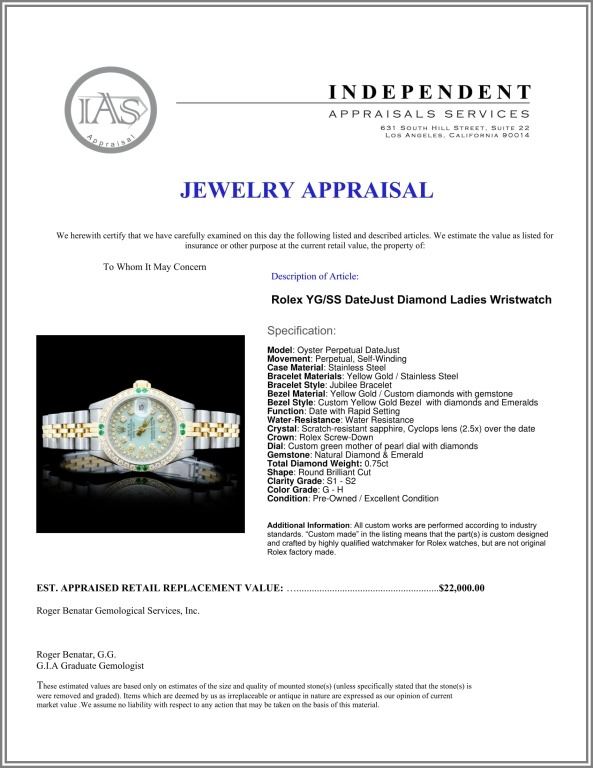 Dial: Custom green mother of pearl dial with diamonds