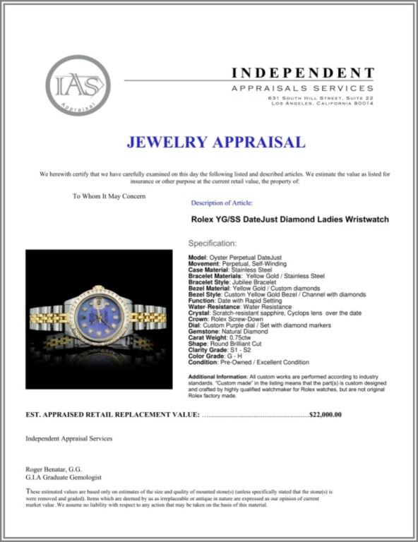 Regarding Appraised Jewelry and Loose Stones - Auctionfarm sends them out to a third party for Retail Replacement Value Appraisals, which are the most common. These types of evaluations are written for insurance needs. This would be the cost to replace the jewelry with an item of equal quality and kind, considered to be the current market price or the replacement value. This type of appraisal is done to protect you in the event of damage or loss of a valuable item. Our appraisals are conducted by independent 3rd Party appraisal firms that utilizes Certified GIA Gemologist. Appraisals should be used for verification of gemstone and/or metal weight, size, and grade only, not actual value. Appraisal value should be considered for insurance purposes only, not actual value, as price varies greatly from retail locations thru out the world. Items should not be purchased with the expectation to resell for appraisal price, or for profit.