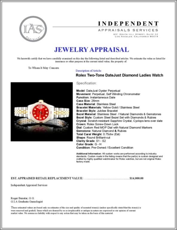 Regarding Appraised Jewelry and Loose Stones - Auctionfarm sends them out to a third party for Retail Replacement Value Appraisals, which are the most common. These types of evaluations are written for insurance needs. This would be the cost to replace the jewelry with an item of equal quality and kind, considered to be the current market price or the replacement value. This type of appraisal is done to protect you in the event of damage or loss of a valuable item. Our appraisals are conducted by independent 3rd Party appraisal firms that utilizes Certified GIA Gemologist. Appraisals should be used for verification of gemstone and/or metal weight, size, and grade only, not actual value. Appraisal value should be considered for insurance purposes only, not actual value, as price varies greatly from retail locations thru out the world. Items should not be purchased with the expectation to resell for appraisal price, or for profit.