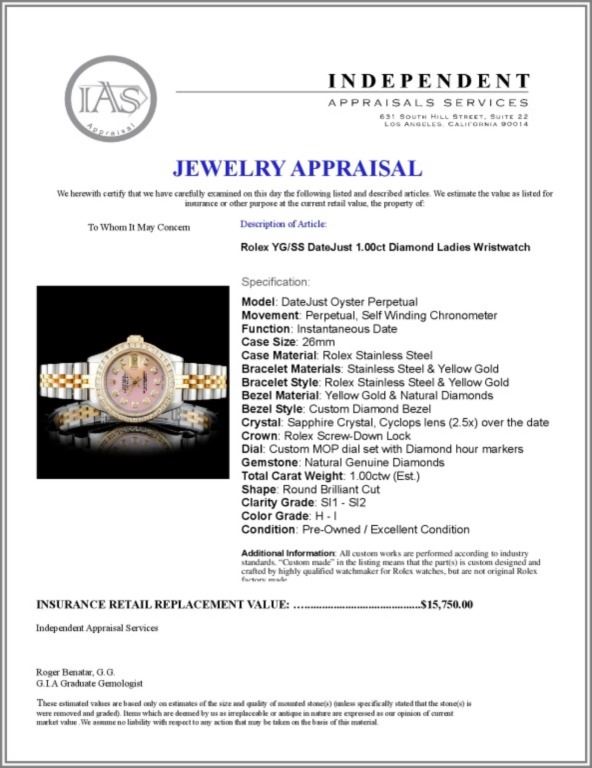 Regarding Appraised Jewelry and Loose Stones - Auctionfarm sends them out to a third party for Retail Replacement Value Appraisals, which are the most common. These types of evaluations are written for insurance needs. This would be the cost to replace the jewelry with an item of equal quality and kind, considered to be the current market price or the replacement value. This type of appraisal is done to protect you in the event of damage or loss of a valuable item. Our appraisals are conducted by independent 3rd Party appraisal firms that utilizes Certified GIA Gemologist. Appraisals should be used for verification of gemstone and/or metal weight, size, and grade only, not actual value. Appraisal value should be considered for insurance purposes only, not actual value, as price varies greatly from retail locations thru out the world. Items should not be purchased with the expectation to resell for appraisal price, or for profit.